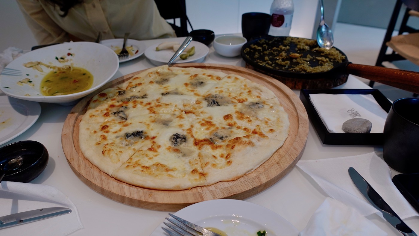도산공원 메종사우스케이프 고로곤졸라피자. 후레쉬 모짜렐라 치즈와 고르곤졸라 치즈의 깊은 풍미를 느낄 수 있는데 조금 짰다.