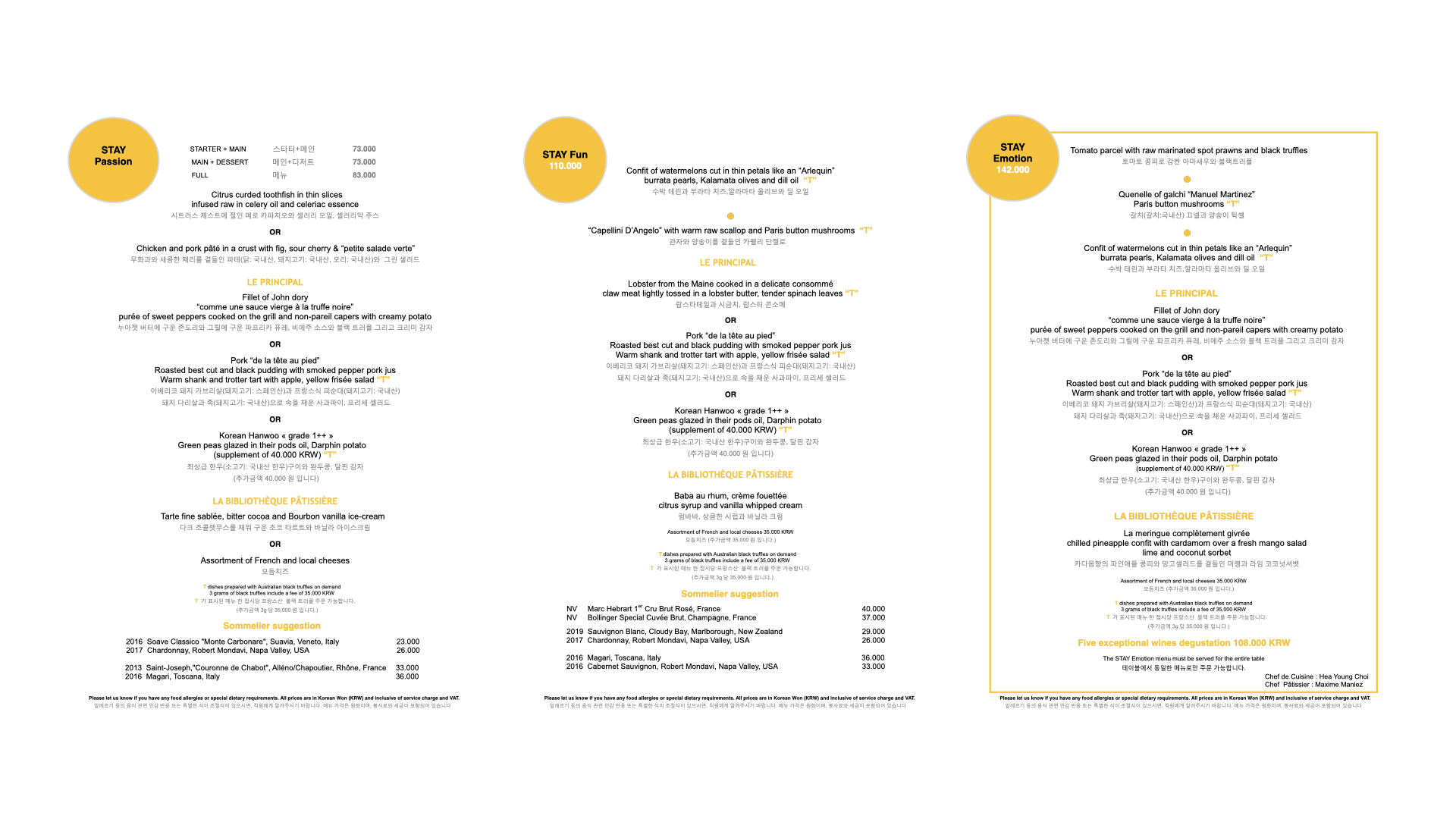 시그니엘서울의 레스토랑은 2개다. 한식 컨템퍼러리 레스토랑 비채나와 프렌치 컨템퍼러리 레스토랑 스테이가 그것. 둘 중에 미쉐린 3스타 셰프 야닉 알레노가 요리하는 프렌치 레스토랑 스테이로 결정했다. (참고로 스테이는 미쉐린가이드 서울 1스타) 점심 식사는 11시 30분부터 오후 2시 30까지 할 수 있고 라스트 오더는 오후 2시다. 식사를 마칠 때쯤 사람이 없을 것을 기대하고 1시 30분에 홈페이지를 통해 예약했다.