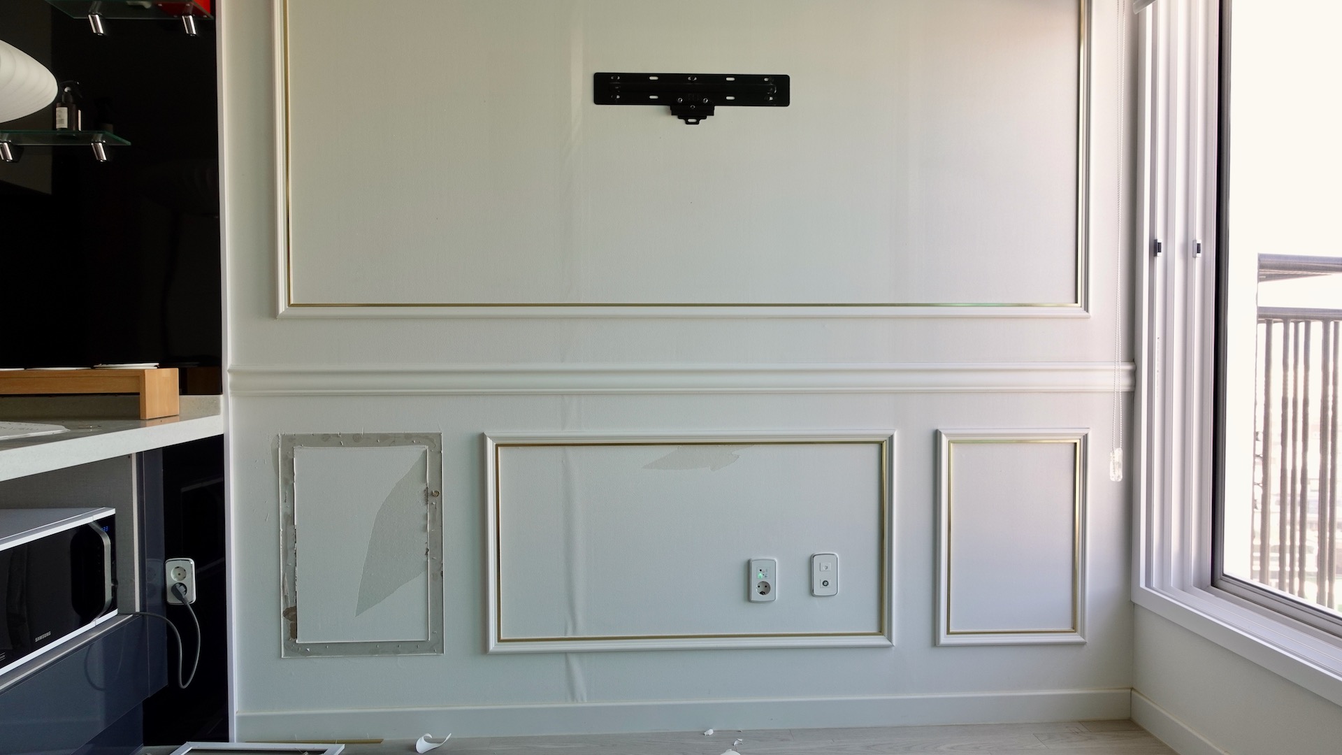 속지작업과 함께 석고보드 이음부분에 내발이 작업도 해준다. 벽걸이 TV 나사 위치의 벽지는 뚫어서 시공할 예정.