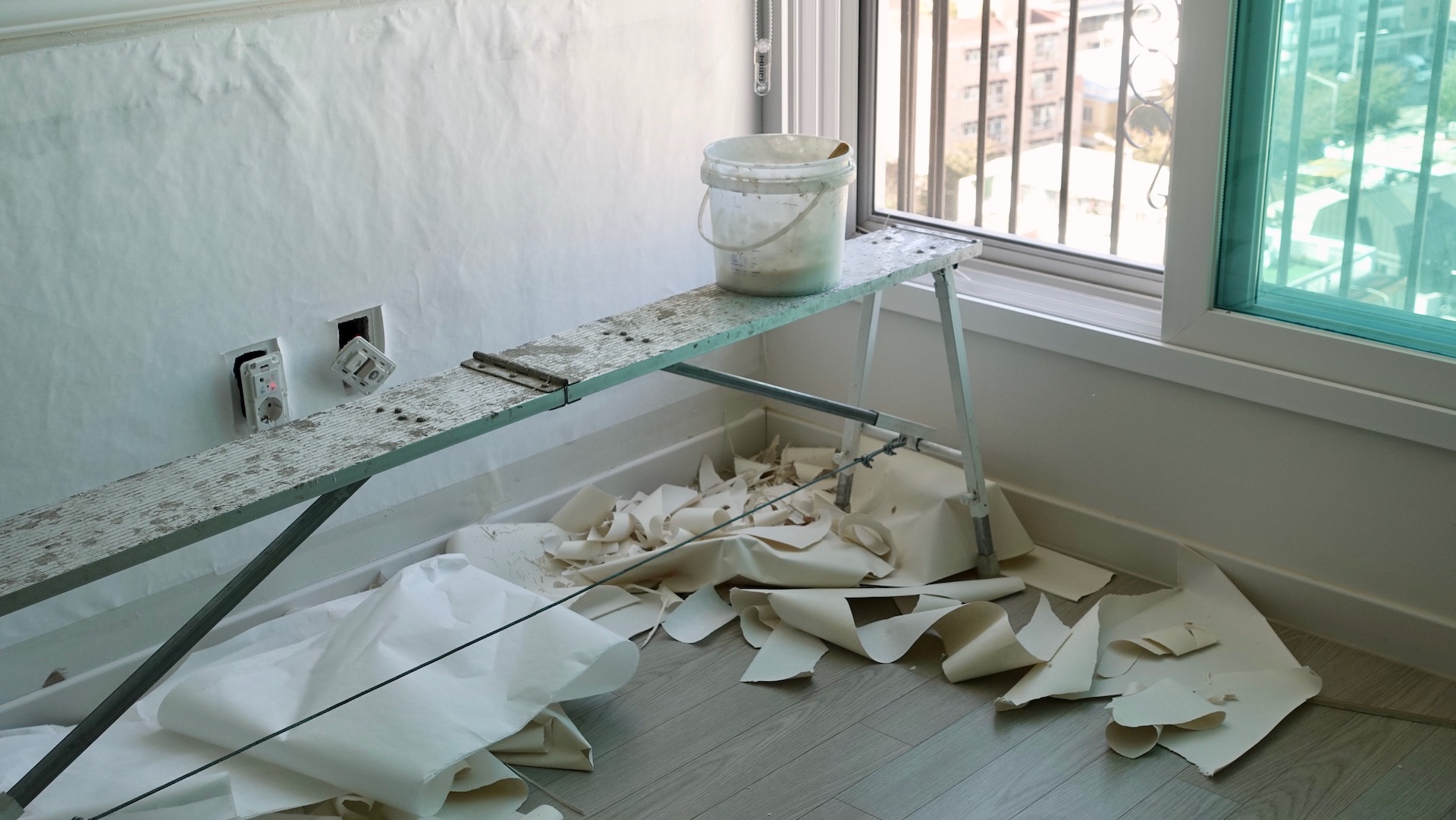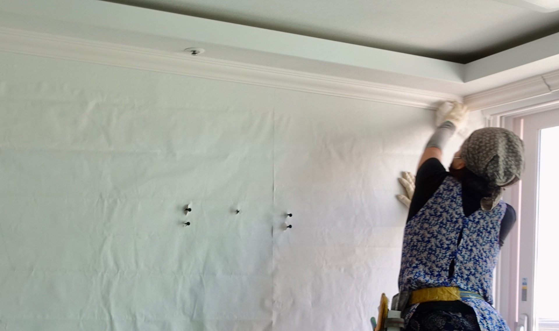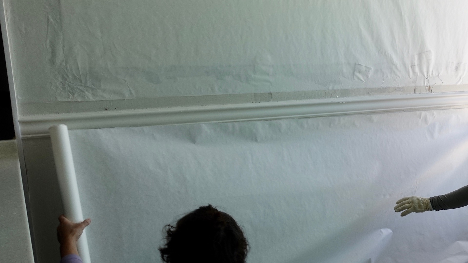 본격적으로 도배 작업이 시작된다. 웨인스코팅 몰딩장식을 제거한 벽면 위에 바로 벽지를 붙이면 자국이 남으므로 속지 작업을 해준다.