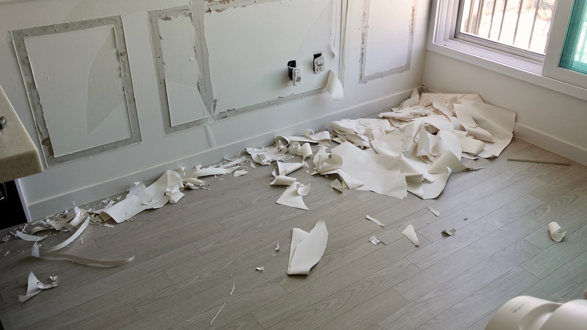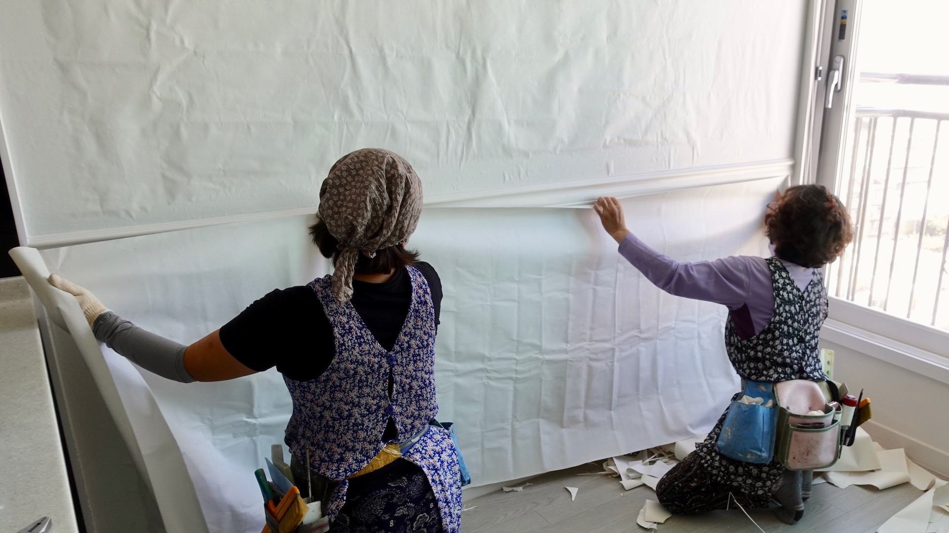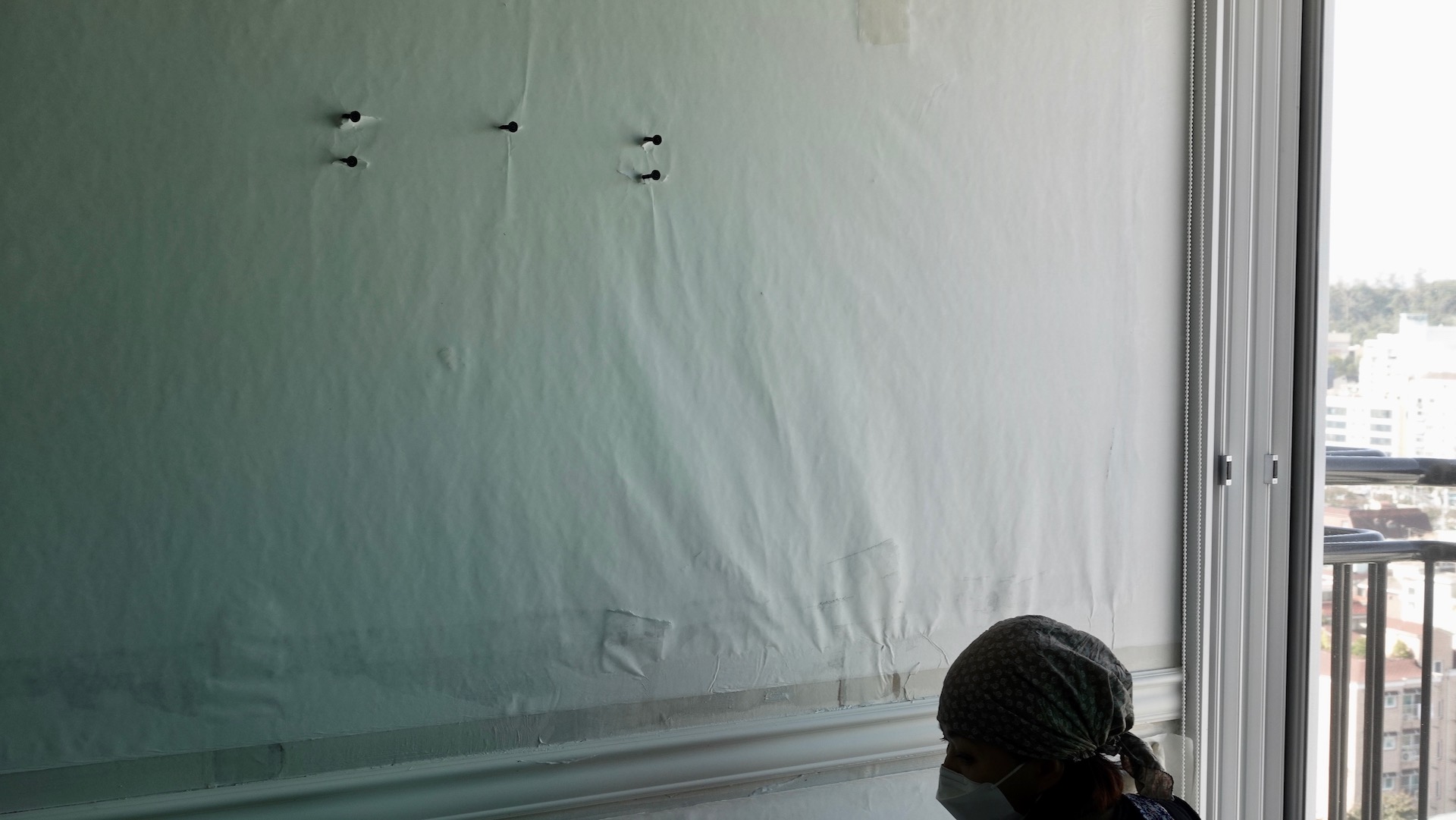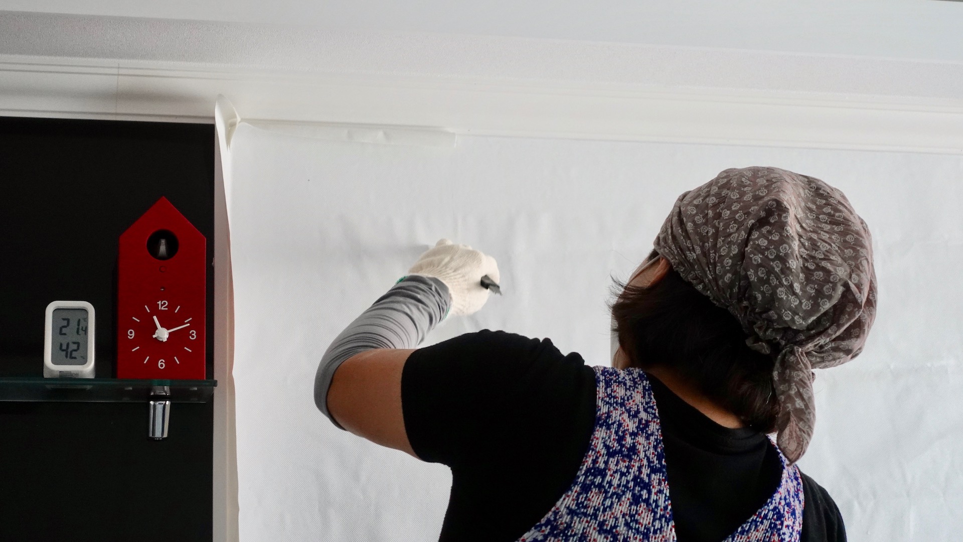 본격적으로 도배 작업이 시작된다. 웨인스코팅 몰딩장식을 제거한 벽면 위에 바로 벽지를 붙이면 자국이 남으므로 속지 작업을 해준다.