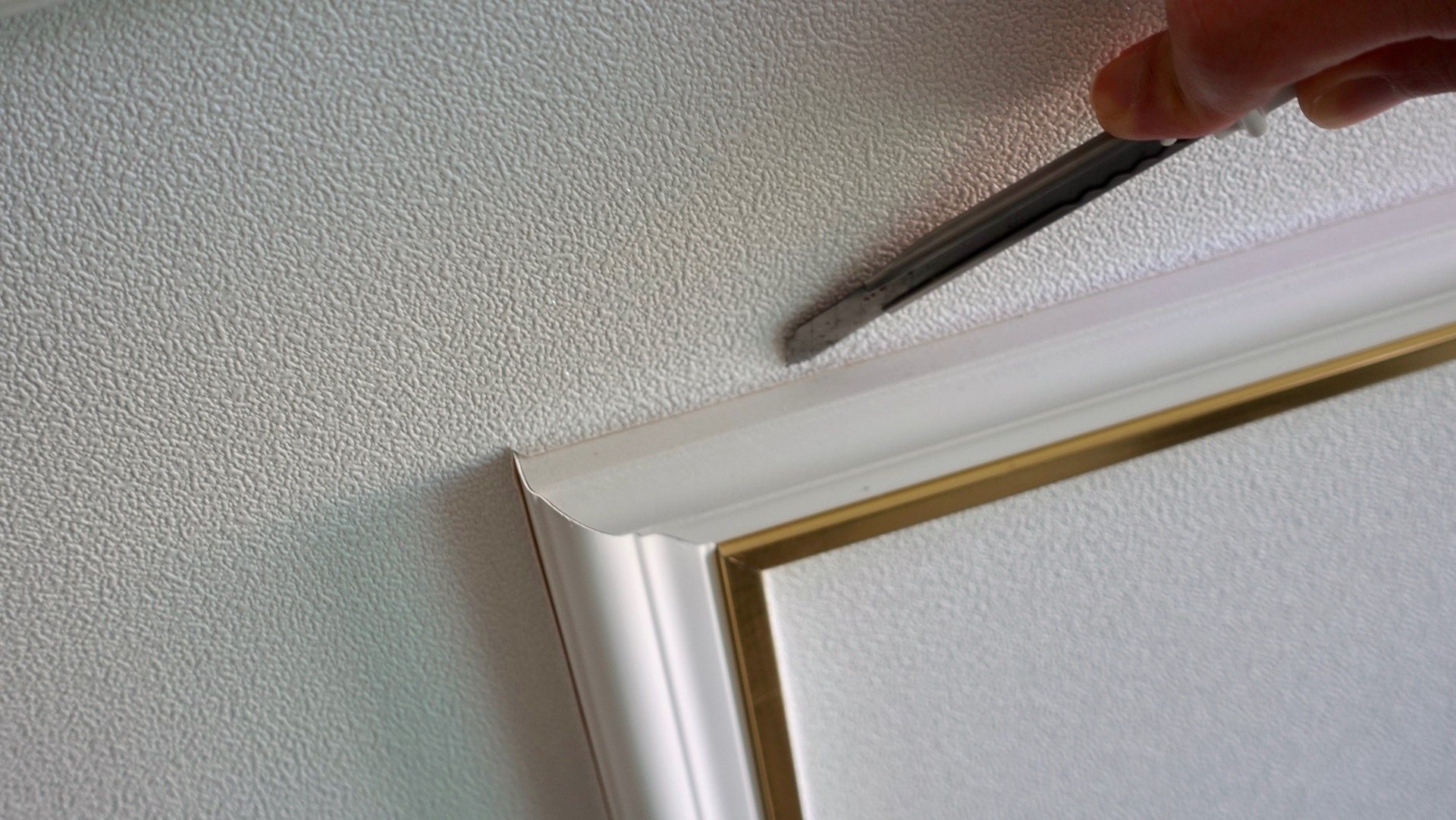 커터칼로 웨인스코팅 몰딩장식을 덮고 있는 벽지를 잘라 낸다.