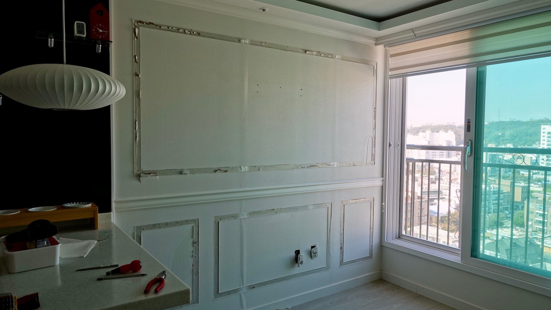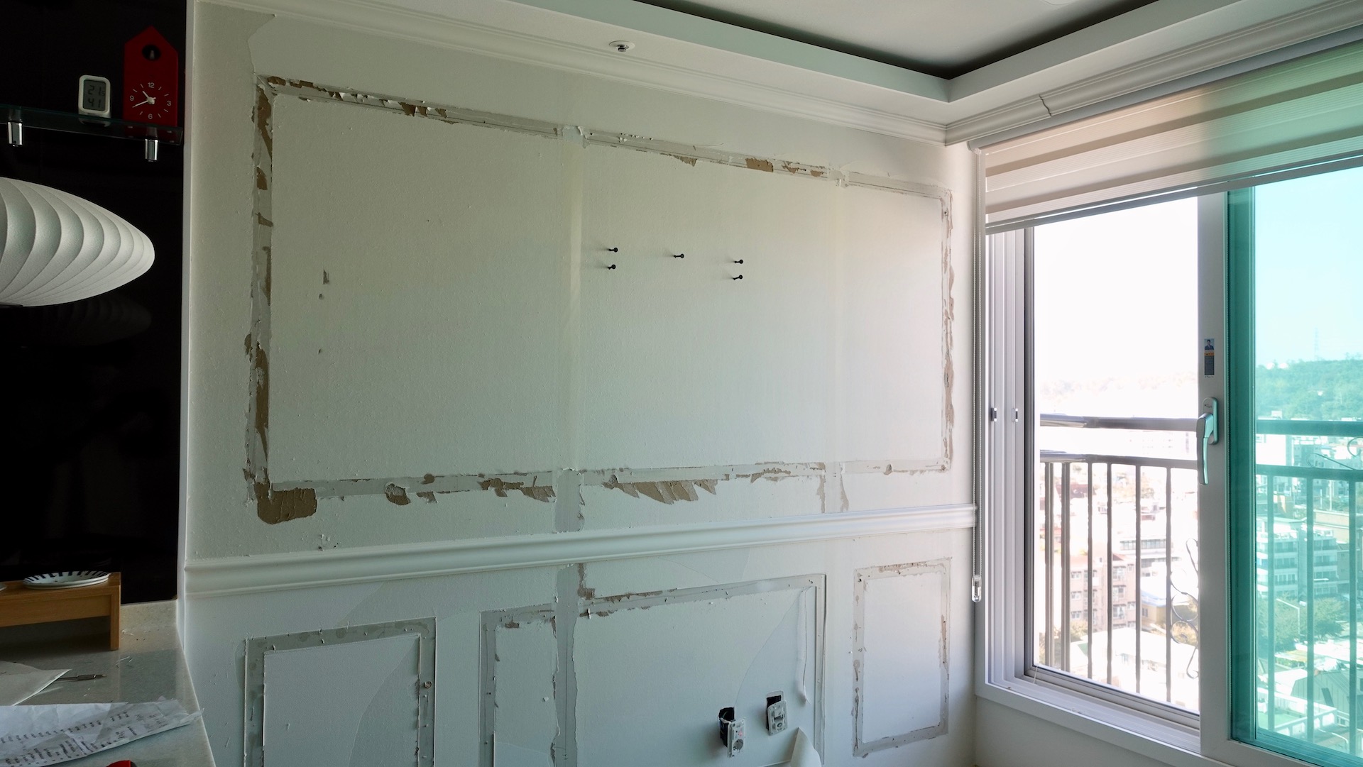 첫 입주할 때 거실 한쪽 벽면에 둘러져 있던 웨인스코팅 몰딩장식을 입주 후 1년이 지나서 떼어내기로 결정했다. 애초에 웨인스코팅 몰딩장식이 없었으면 했지만 흠집하나 없는 것을 추가 비용을 내고 떼어내는 게 부담스럽게 느껴져서 미루고 있었는데 이번에 하자보수 미팅을 진행하다가 도배를 새롭게 할 수 있는 기회가 있어서 셀프로 몰딩을 떼어내기로 했다.