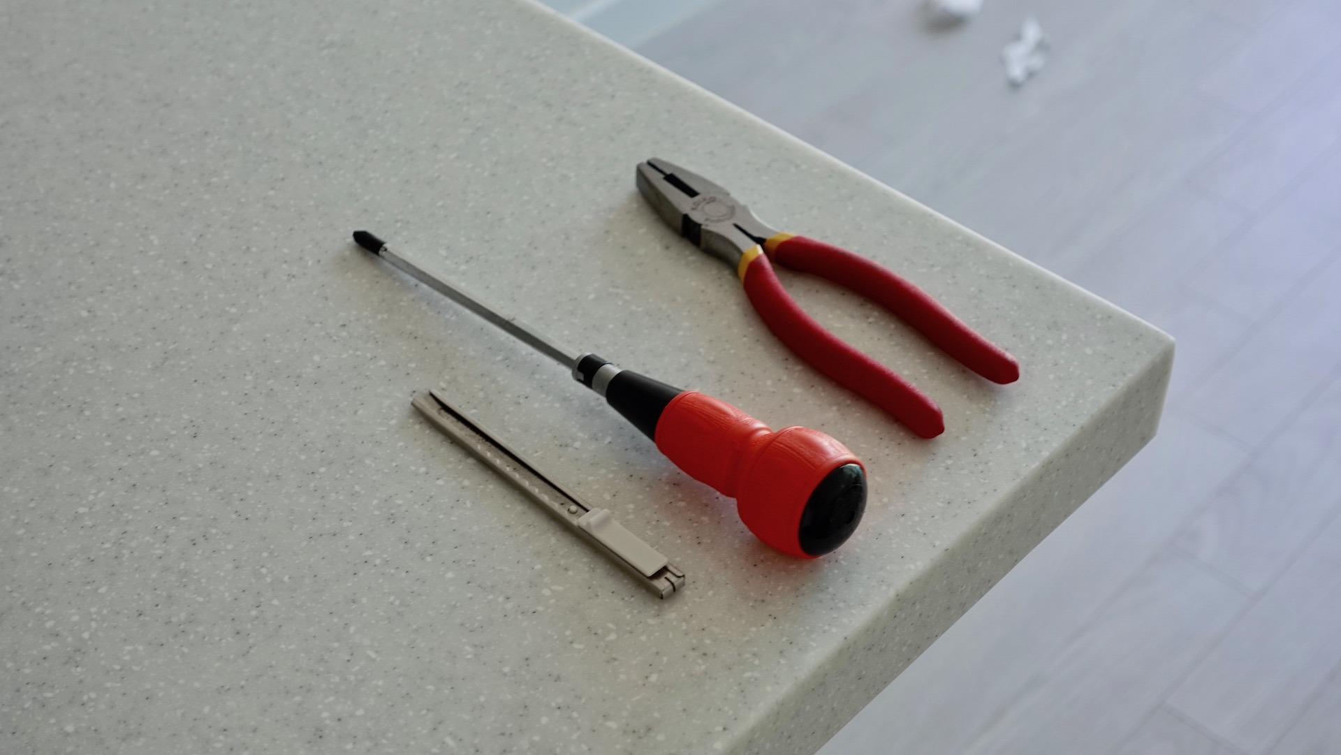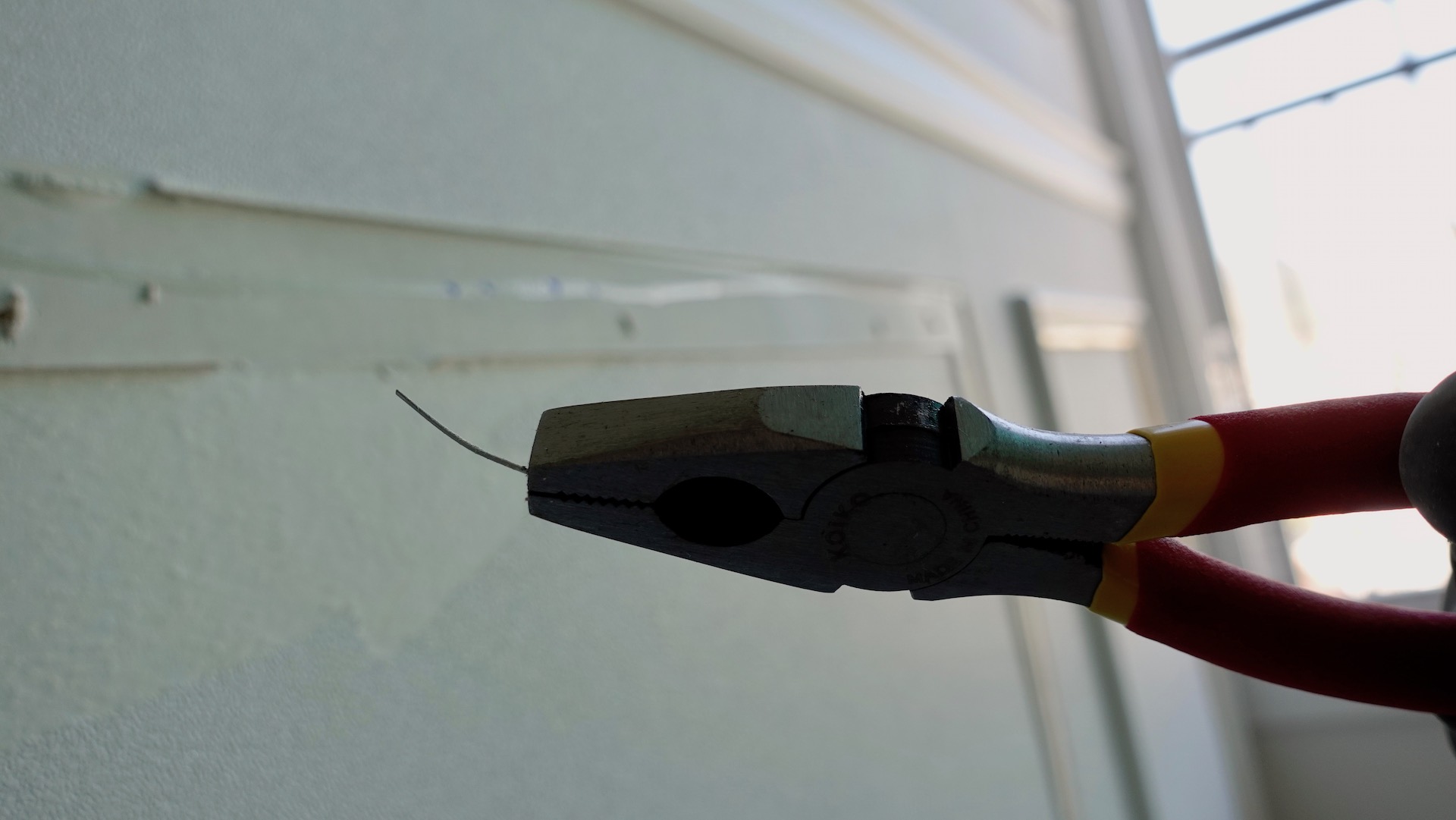 하자보수 팀에서 철거는 해주지 않음으로 직접 몰딩을 제거해보기로 한다. 필요한 장비는 커터칼, 일자드라이버, 그리고 뺀찌. 커터칼은 벽지를 자르는 용도, 일자드라이버는 웨인스코팅 몰딩장식을 떼어내는 용도, 뺀찌는 웨인스코팅 몰딩장식을 제거한 뒤 남은 타카심을 떼어내기 위한 용도다.