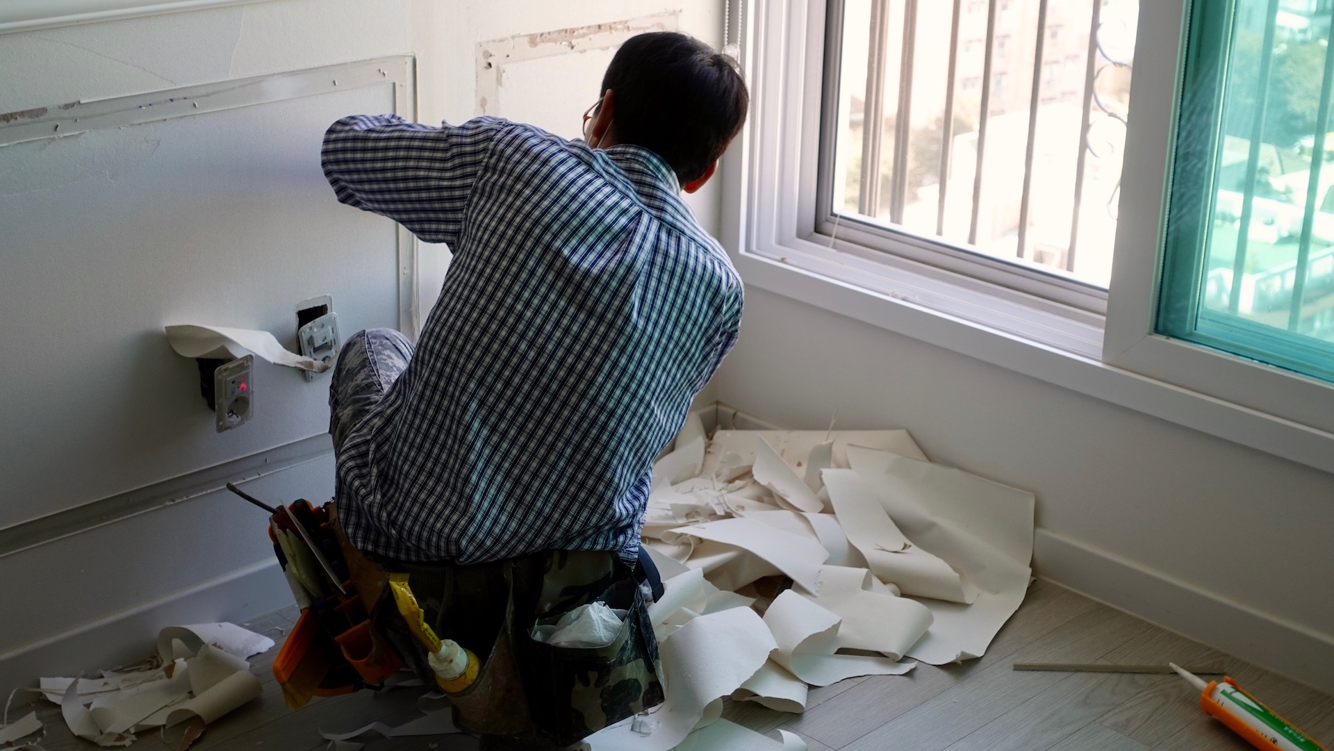 미처 떼어내지 못한 타카심을 깔끔하게 재거해주시는 도배 사장님.