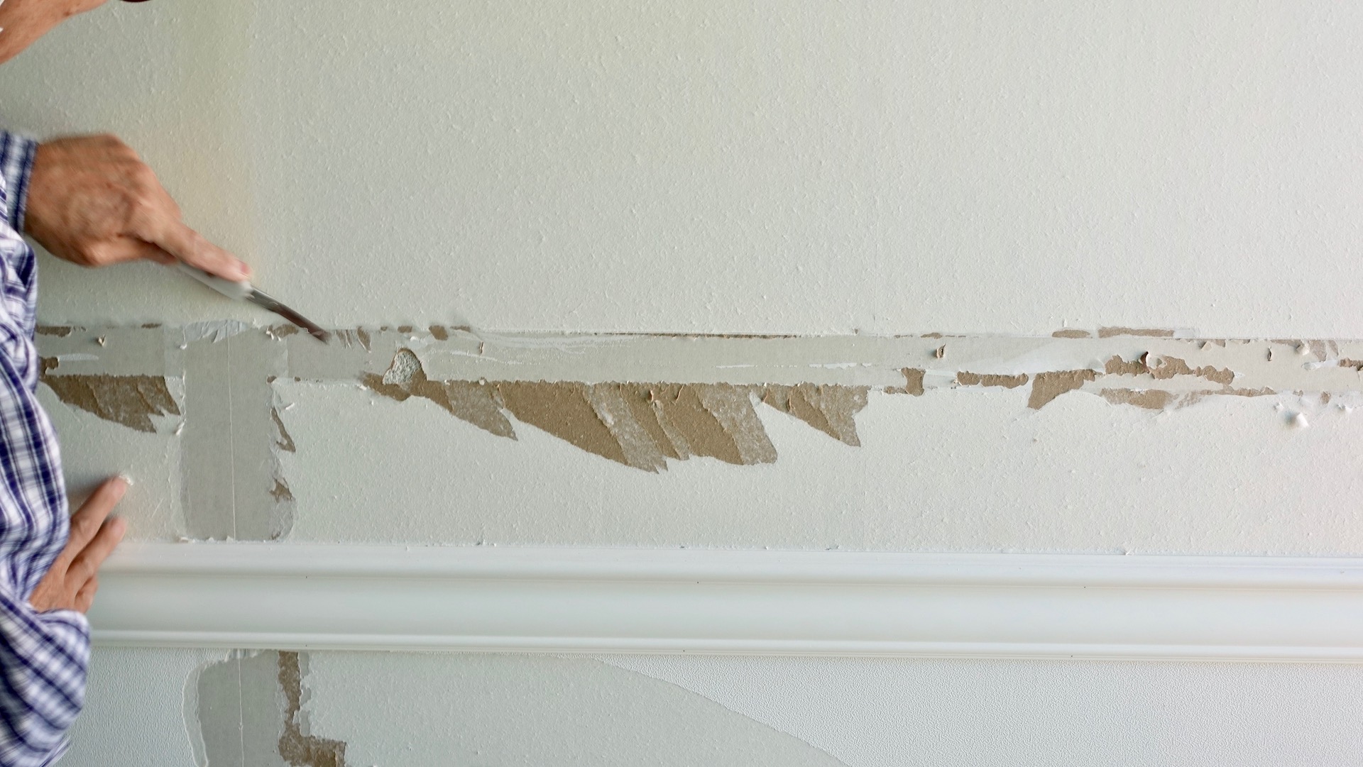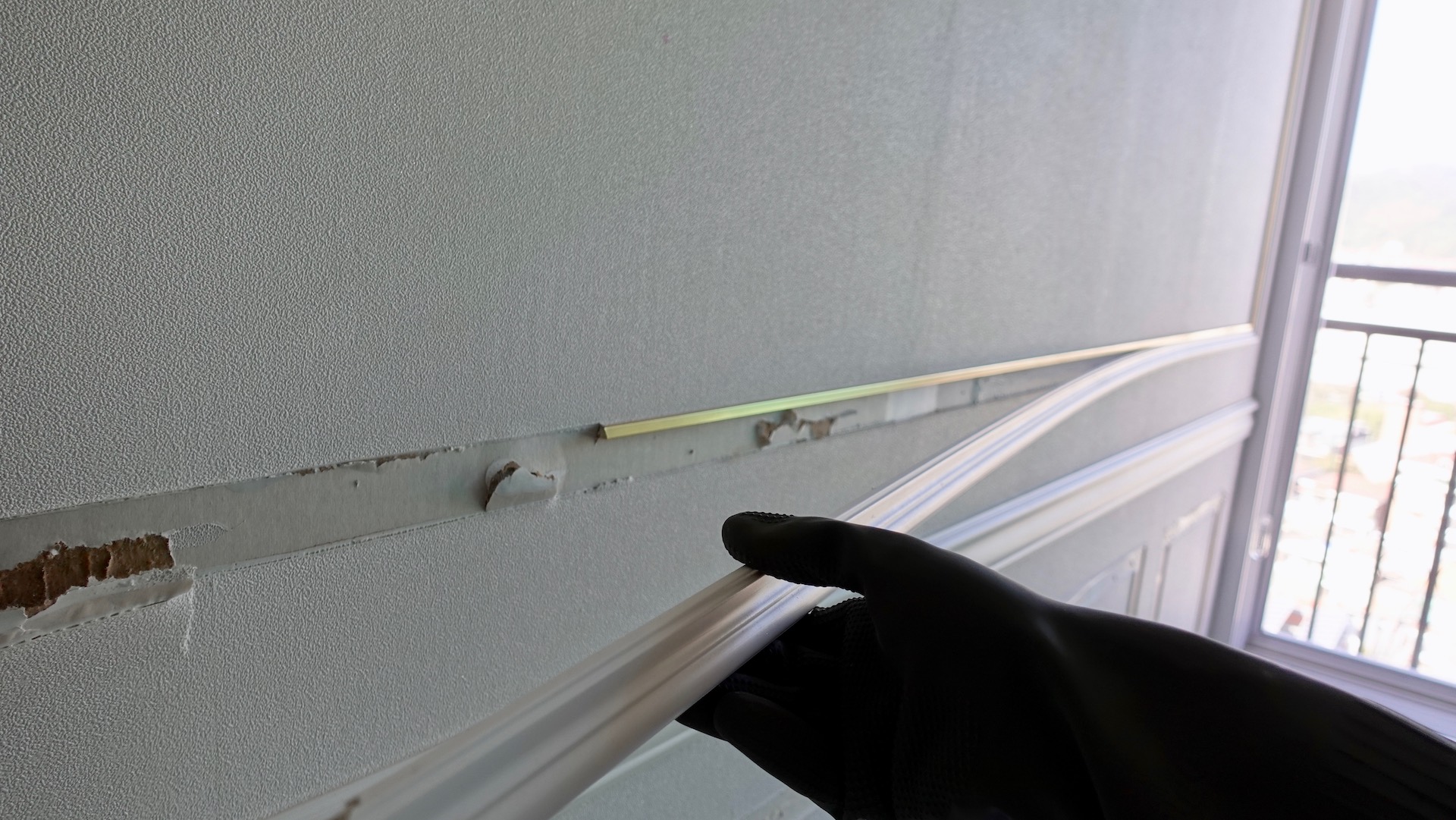 테스트로 왼쪽 하단 몰딩을 떼어 낸 벽의 모습.