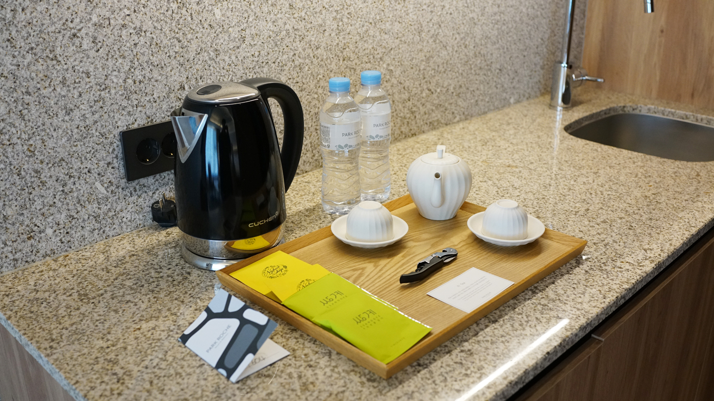 커피포트와 티팩 4개와 티컵, 와인오프너 와인잔 등 어매니티가 있다.