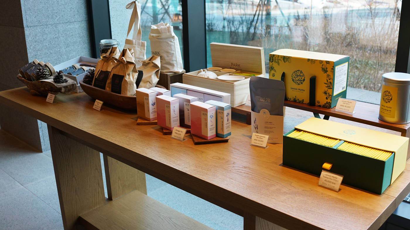 로비에 객실에 비치된 티팩과 PB상품이 진열되었다.