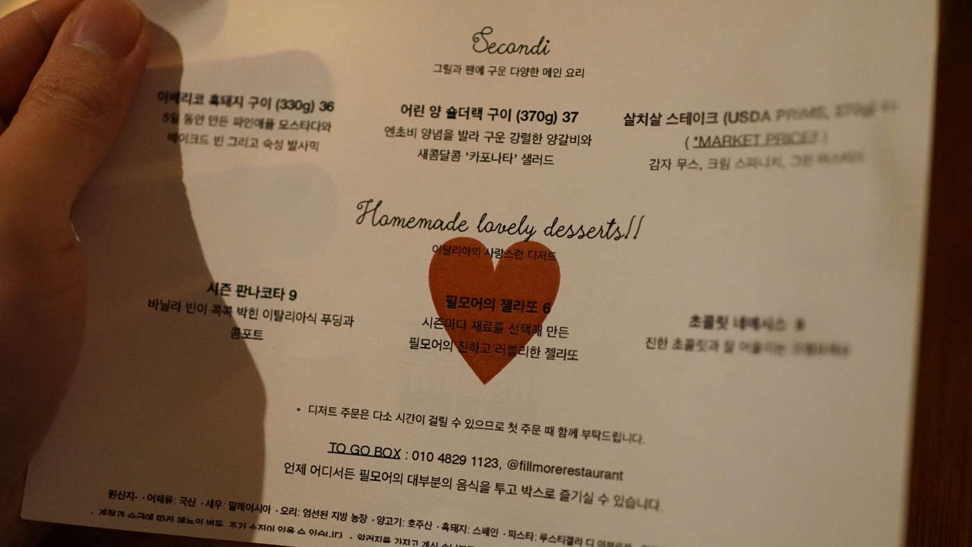 얼마 전 두 번째 방문한 필모어는 디너 예약을 해 방문했다. 1시간 단위로 예약할 수 있었고, 마지막 예약 타임인 8시(거리두기로 인해 9시 마감)에 한 자리가 남아 있었다. 첫 방문 때 이곳 살치살 스테이크가 맛있다 하여 조만간 와 맛보자는 계획이었는데 밸런타인데이를 맞아 친구가 호기롭게 사주었다. 지난번 봉골레 파스타의 감동을 또 느끼기 위해 봉골레 파스타와 살치살 스테이크를 주문했다. 논알콜 음료가 없어 탄산수를 곁들였다. 파스타는 이전의 맛 그대로였고 살치살 스테이크도 만족스러웠다. 시간이 좀 남았고 그냥 떠나기 아쉬워 디저트로 판나코타를 주문해 먹었다. 디저트까지 셰프의 정성이 느껴지는 맛.