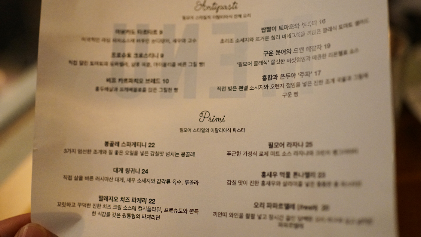작년 여름 지인 추천으로 일산 밤가시마을 필모어 런치를 먹었다. 예약 없이 워크인으로 방문했는데 내부 예약이 가득 차서 야외석에 앉아 먹었다. 메뉴는 가볍게 라자냐와 봉골레 파스타를 주문했다. 먼저 라자냐의 맛은 꽤 괜찮았다. 합정동에 회사를 다니던 시절 사무실 근처 카밀로라자네리아에서 먹었던 최고의 라자냐에 맛들린 지라 라자냐 맛에 대한 기준이 높다. (카밀로라자네리아 옆 골목 자매식당인 첸토페르첸토가 오픈한 뒤로 이곳 라자냐 맛이 조금 덜해졌다.) 하지만 뒤이어 나온 봉골레 파스타에 감동했다. 서울 여느 미쉘린 레스토랑 파스타보다 맛있었다. 게다가 1메뉴를 2플레이트에 담아준 서비스도 좋았다.