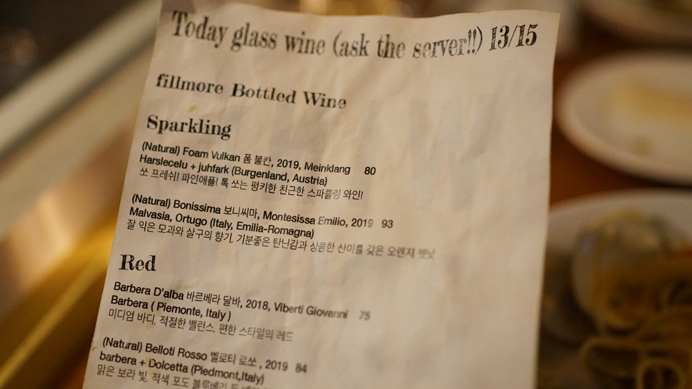 얼마 전 두 번째 방문한 필모어는 디너 예약을 해 방문했다. 1시간 단위로 예약할 수 있었고, 마지막 예약 타임인 8시(거리두기로 인해 9시 마감)에 한 자리가 남아 있었다. 첫 방문 때 이곳 살치살 스테이크가 맛있다 하여 조만간 와 맛보자는 계획이었는데 밸런타인데이를 맞아 친구가 호기롭게 사주었다. 지난번 봉골레 파스타의 감동을 또 느끼기 위해 봉골레 파스타와 살치살 스테이크를 주문했다. 논알콜 음료가 없어 탄산수를 곁들였다. 파스타는 이전의 맛 그대로였고 살치살 스테이크도 만족스러웠다. 시간이 좀 남았고 그냥 떠나기 아쉬워 디저트로 판나코타를 주문해 먹었다. 디저트까지 셰프의 정성이 느껴지는 맛.