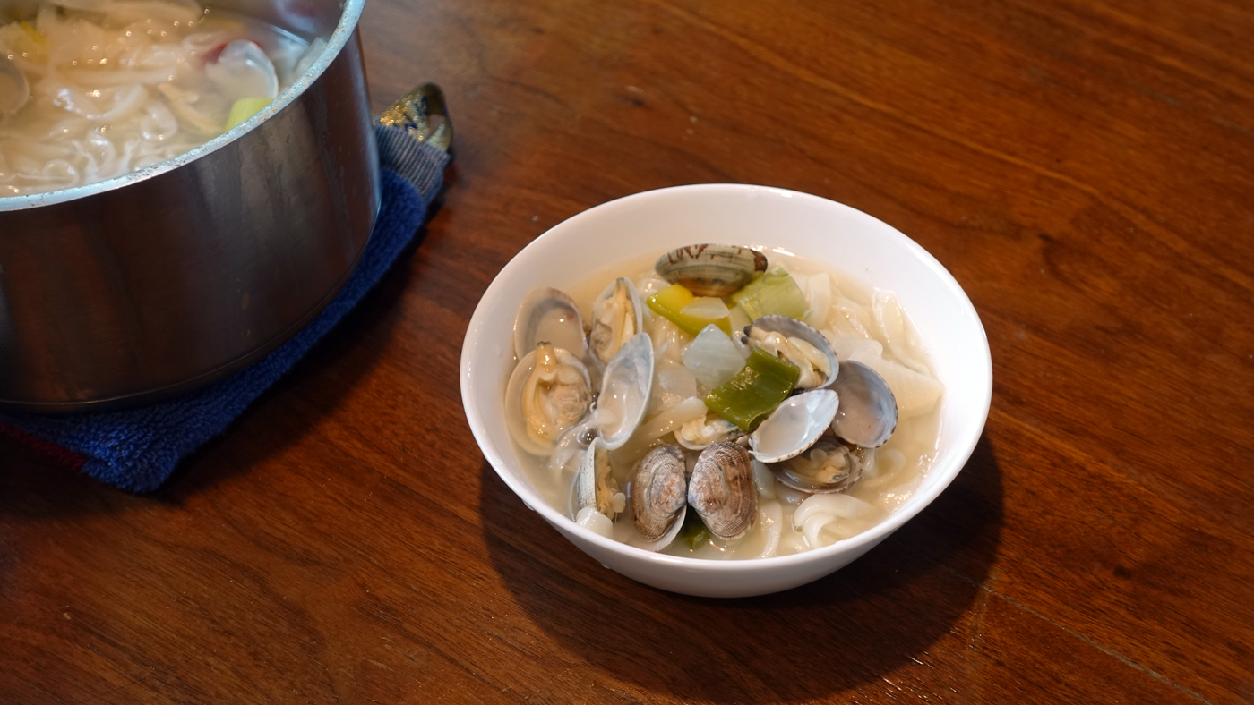 그리고 다음날. 에어비앤비가 호텔보다 좋은 건 골목골목 맛집을 집앞에 두고 있는 것도 있지만, 숙소에서 요리를 할 수 있는 점도 뺄 수 없어서 요리를 해먹었다. 메뉴는 바지락 칼국수. 전날 집에서 재료를 손질해 와서 바로 끓여 먹었다.