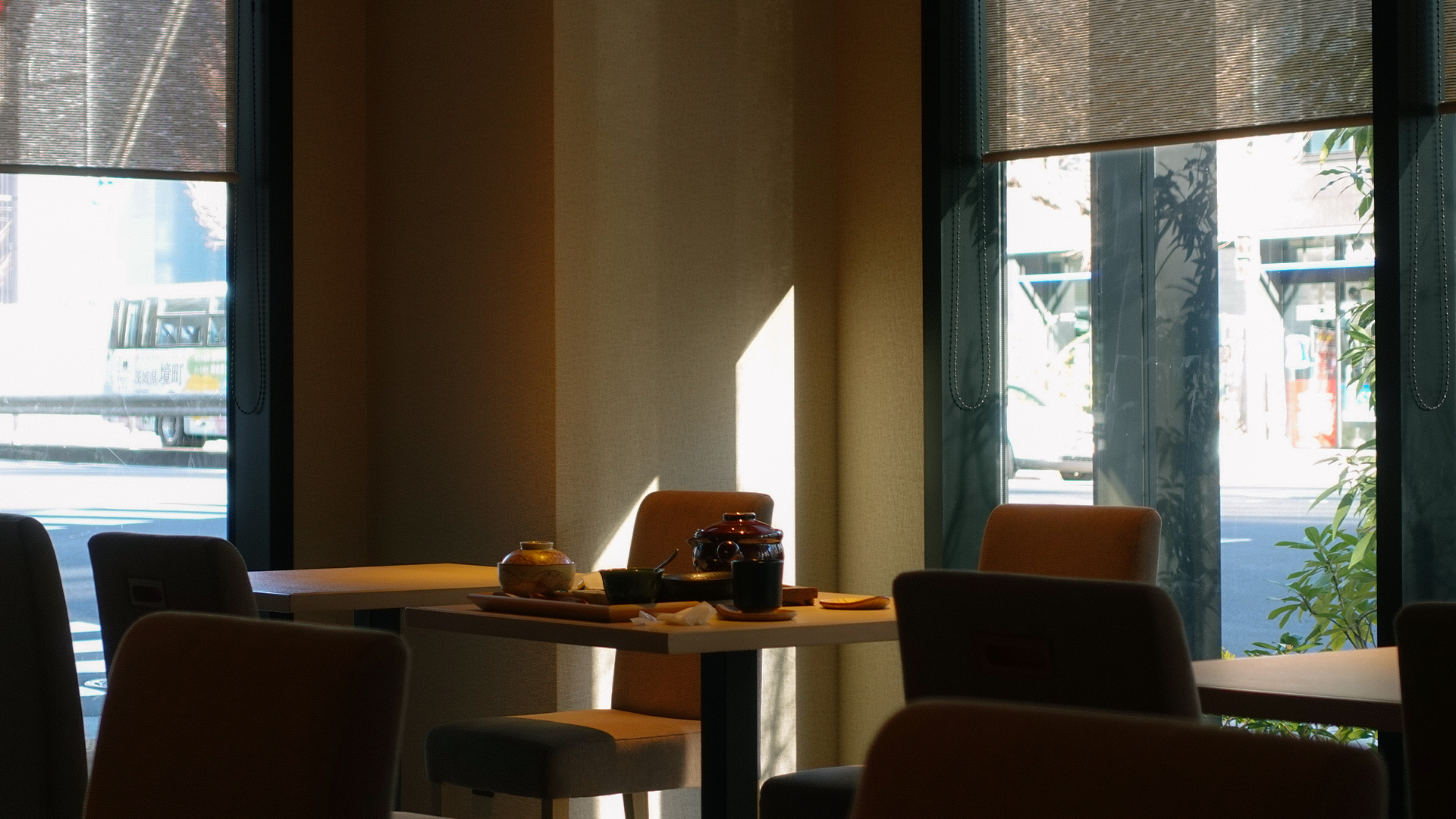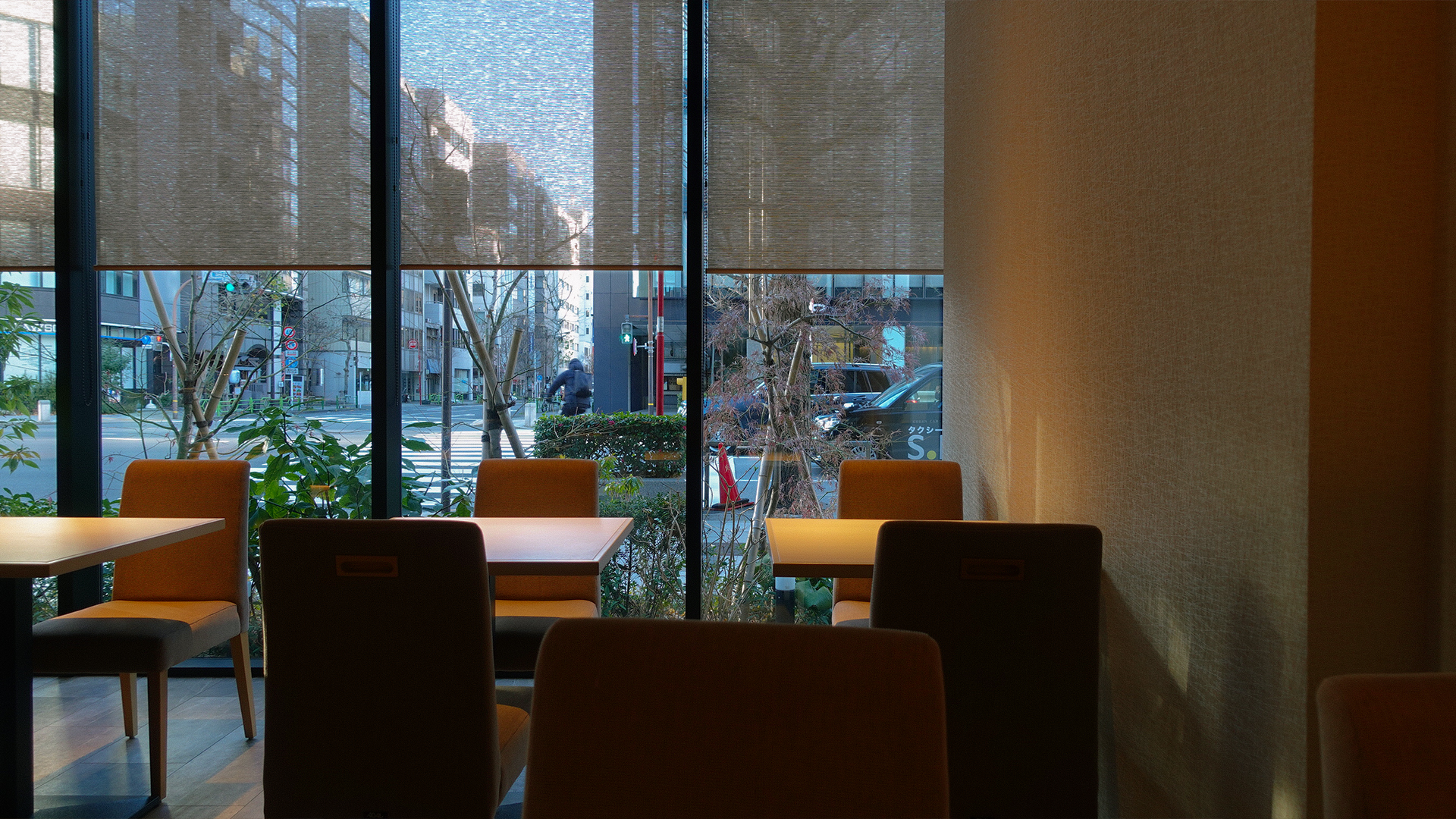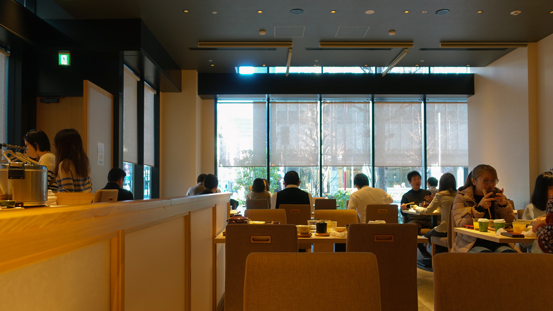 카에가와 레스토랑은 헤이세이 스트리트와 야에수 스트리트를 낀 코너에 자리해 평일 아침 창밖 풍경을 구경할 수 있었다. 바쁘게 하루를 시작하는 사람들.