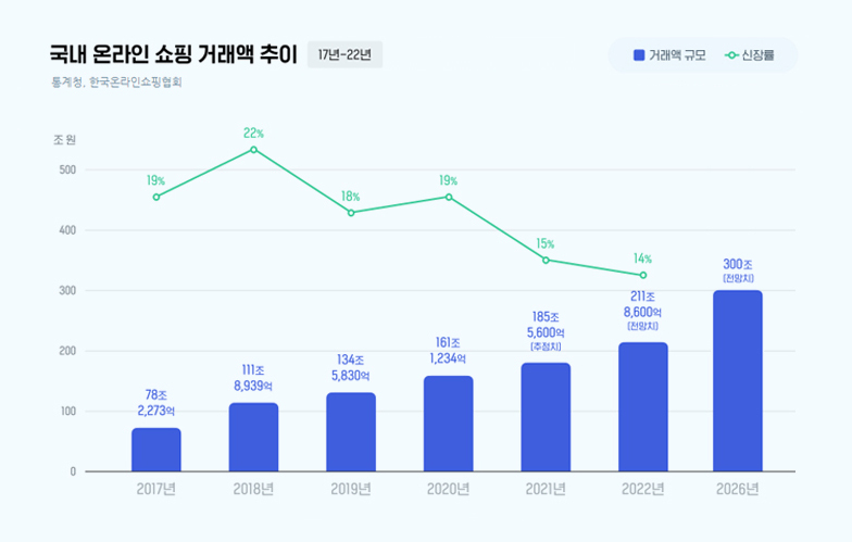 통계로 보아도 이커머스 비즈니스 전망은 좋다. OECD에 따르면 코로나 이후 경제성장률은 연간 2%로 이하로 전망되고 하향세가 지속되다 1%대까지 떨어질 것이라고 한다 . 이렇게 경기가 둔화하는 가운데에도 국내 이커머스 시장규모는 2017년 이후 연평균 17% 이상 성장하고 있으며, 2026년을 기점으로 연간 거래액이 300조를 넘어설 것으로 보고 있다. 돈의 흐름이 기하급수적으로 이커머스 오픈마켓 플랫폼에 몰리고 있다. 이 달리는 말에 올리 탈 것인지, 말 것인지는 선택의 문제이다.
