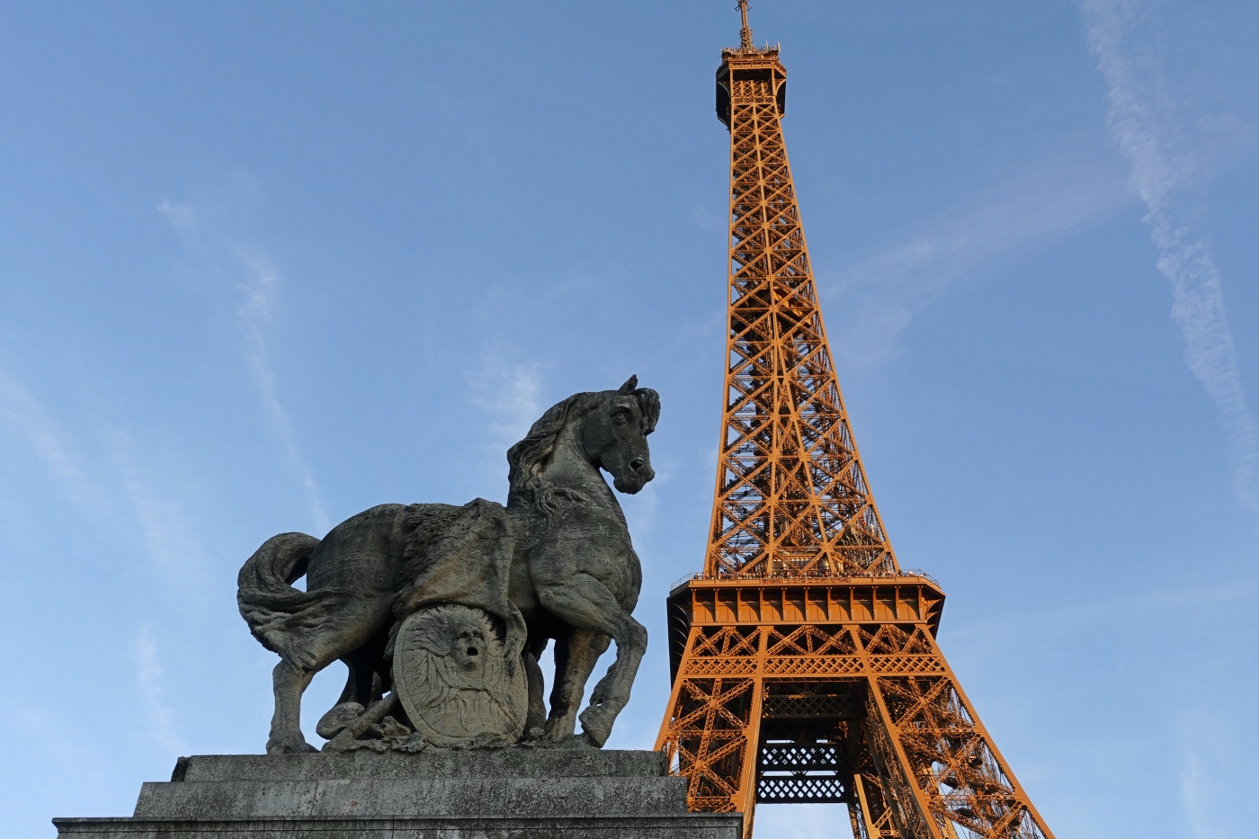 해질녘 주황빛 해가 비추는 에펠탑이 유난히 아름답다. 파리 상공을 지나는 비행운이 멋지다.