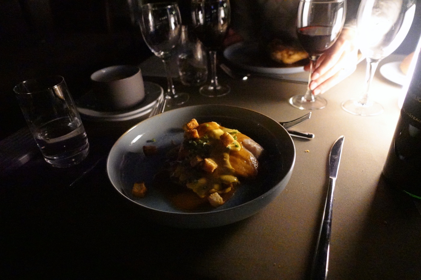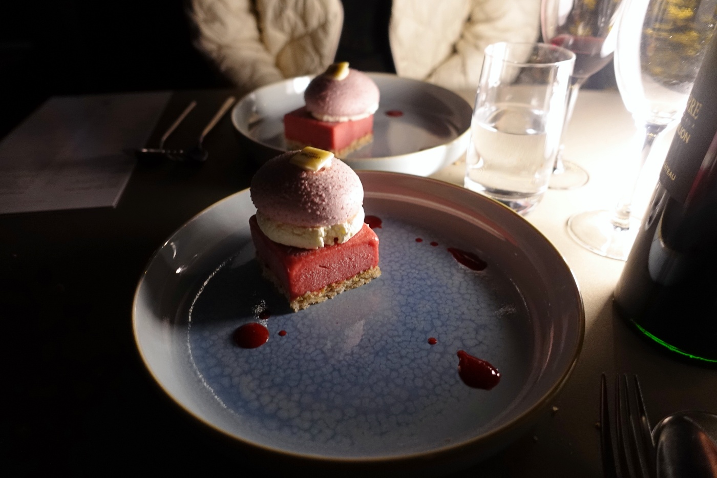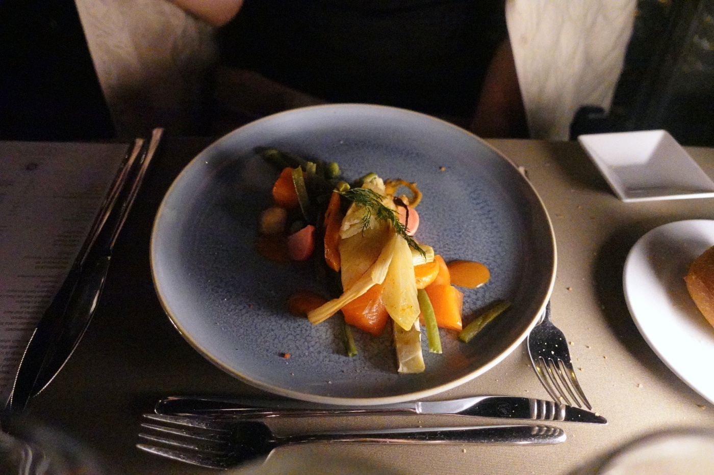 코스요리는 안내된 메뉴판에서 각자 선택할 수 있었다. 담당 서버의 친절한 메뉴 안내를 받아 나는 스타터로 달팽이 타르트를 아내는 연어요리를 선택했고 메인은 모두 농어요리를 골랐다. 메뉴에 메인 메뉴로 송아지 요리도 있었는데 하나씩 시켜서 나누어 먹을 걸 그랬다. 부족한 영어로 빠르게 대답해야 하는 어수선한 분위기라 생선요리로 통일해 주문해버렸다. 웰컴드링크로 샴페인이 나왔고 와인은 레드와인 한 병이 제공됐다. 생선요리를 먹어서인지 서버가 무료로 화이트 와인도 몇 잔 따라 주었다. 메인 이후에는 치즈요리와 디저트가 나왔다.