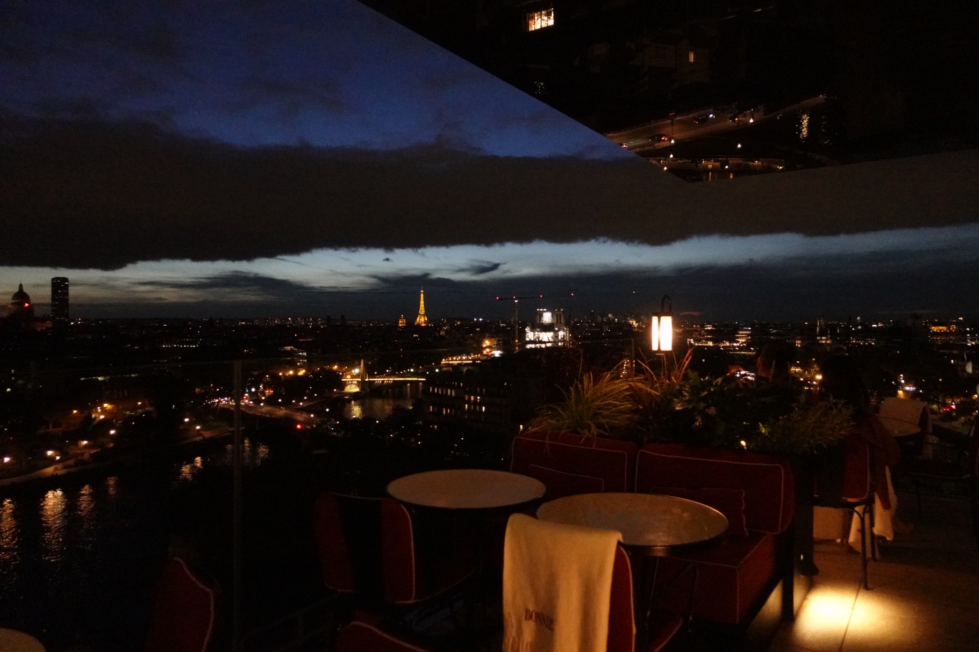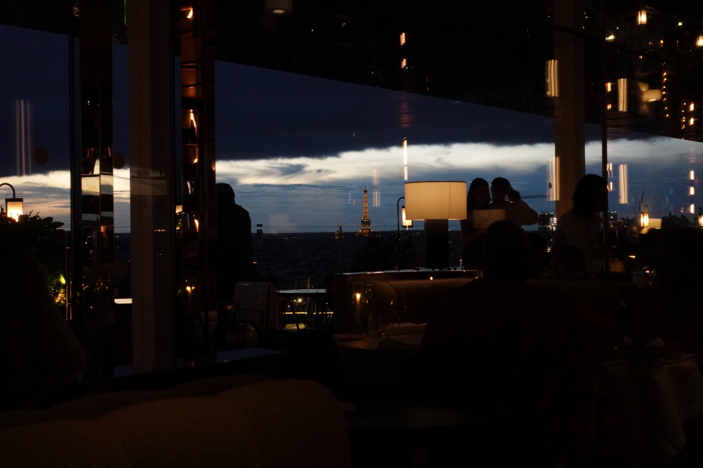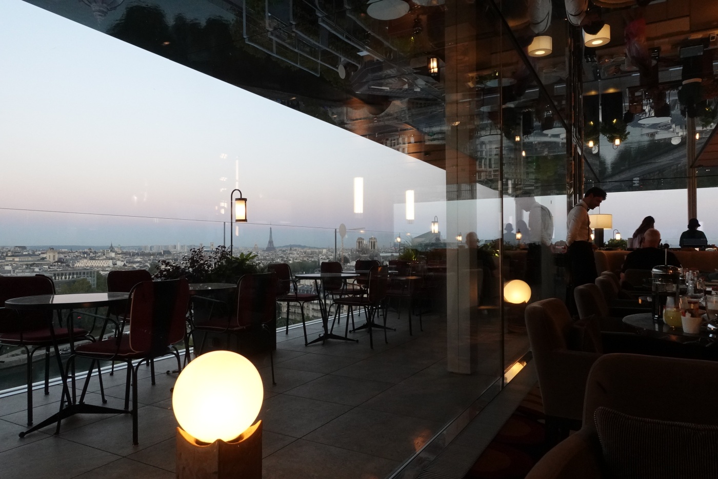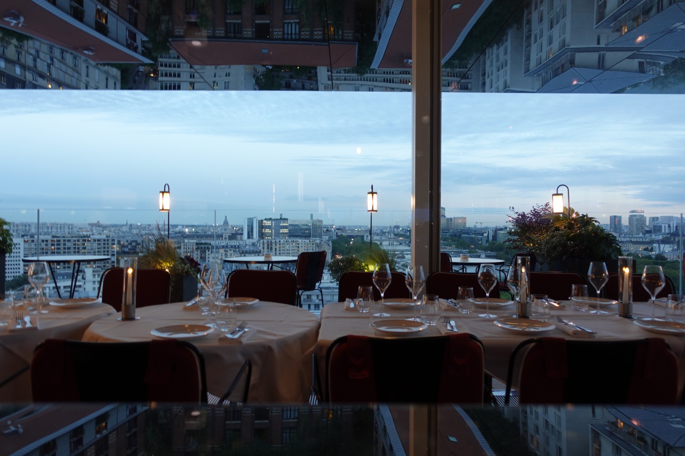 저녁 식사는 스타터와 메인 디저트까지 곁드릴 예정이라면 2시간 넘게 걸리니 6시 대에 예약해서 비교적 뷰가 좋은 자리에서 일몰을 감상하며 식사를 하는 걸 추천한다. 세상에서 뷰가 가장 좋은 식당이 아닐까 싶다. 파리 시내를 360도 조망한다. 게다가 천장이 거울로 마감되어서 센 강과 파리 거리가 비추어 보인다. 천장에 설치된 거울은 단순한 마감재가 아닌 올라프 엘리아슨의 설치 작품인 ‘더 씽 시티’이기도 하다.