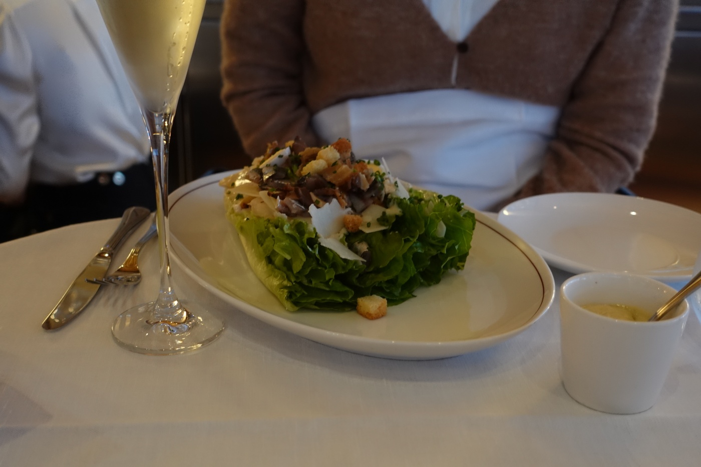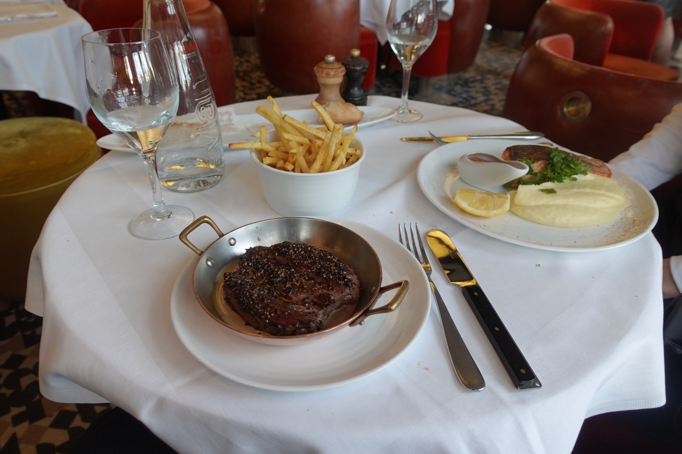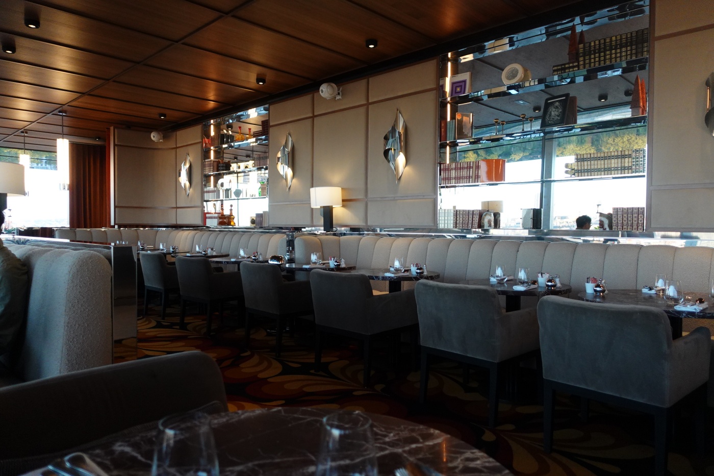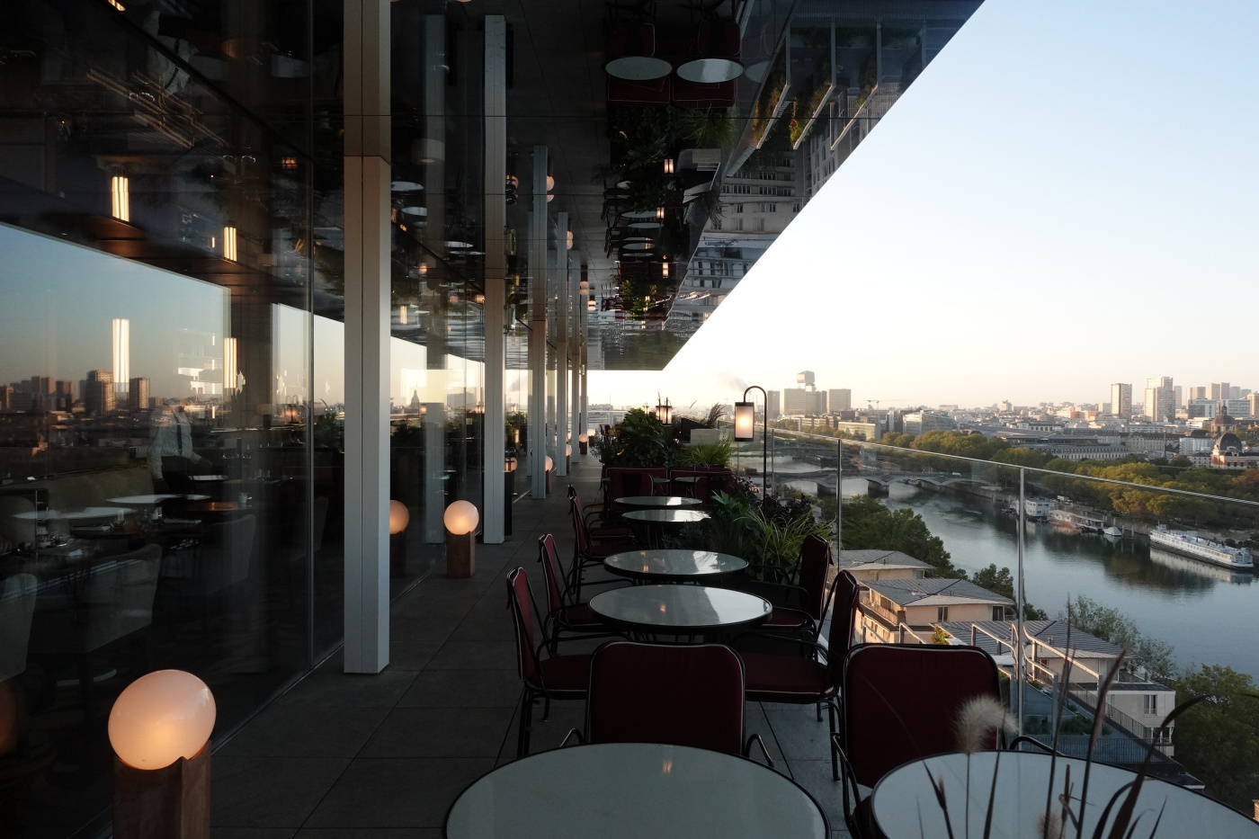 저녁 식사는 스타터와 메인 디저트까지 곁드릴 예정이라면 2시간 넘게 걸리니 6시 대에 예약해서 비교적 뷰가 좋은 자리에서 일몰을 감상하며 식사를 하는 걸 추천한다. 세상에서 뷰가 가장 좋은 식당이 아닐까 싶다. 파리 시내를 360도 조망한다. 게다가 천장이 거울로 마감되어서 센 강과 파리 거리가 비추어 보인다. 천장에 설치된 거울은 단순한 마감재가 아닌 올라프 엘리아슨의 설치 작품인 ‘더 씽 시티’이기도 하다.