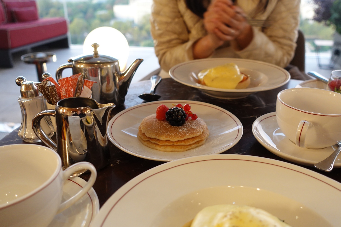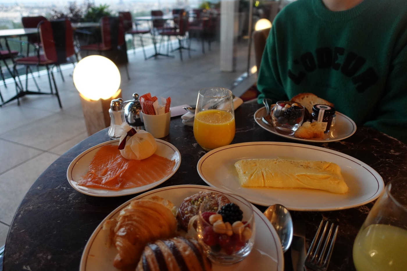가을 아침 날씨가 꽤 쌀쌀해서 테라스 좌석 보다 내부로 안내했다. 내부에서 테라스 너머로 보이는 파리 도심 모습도 아름답다.