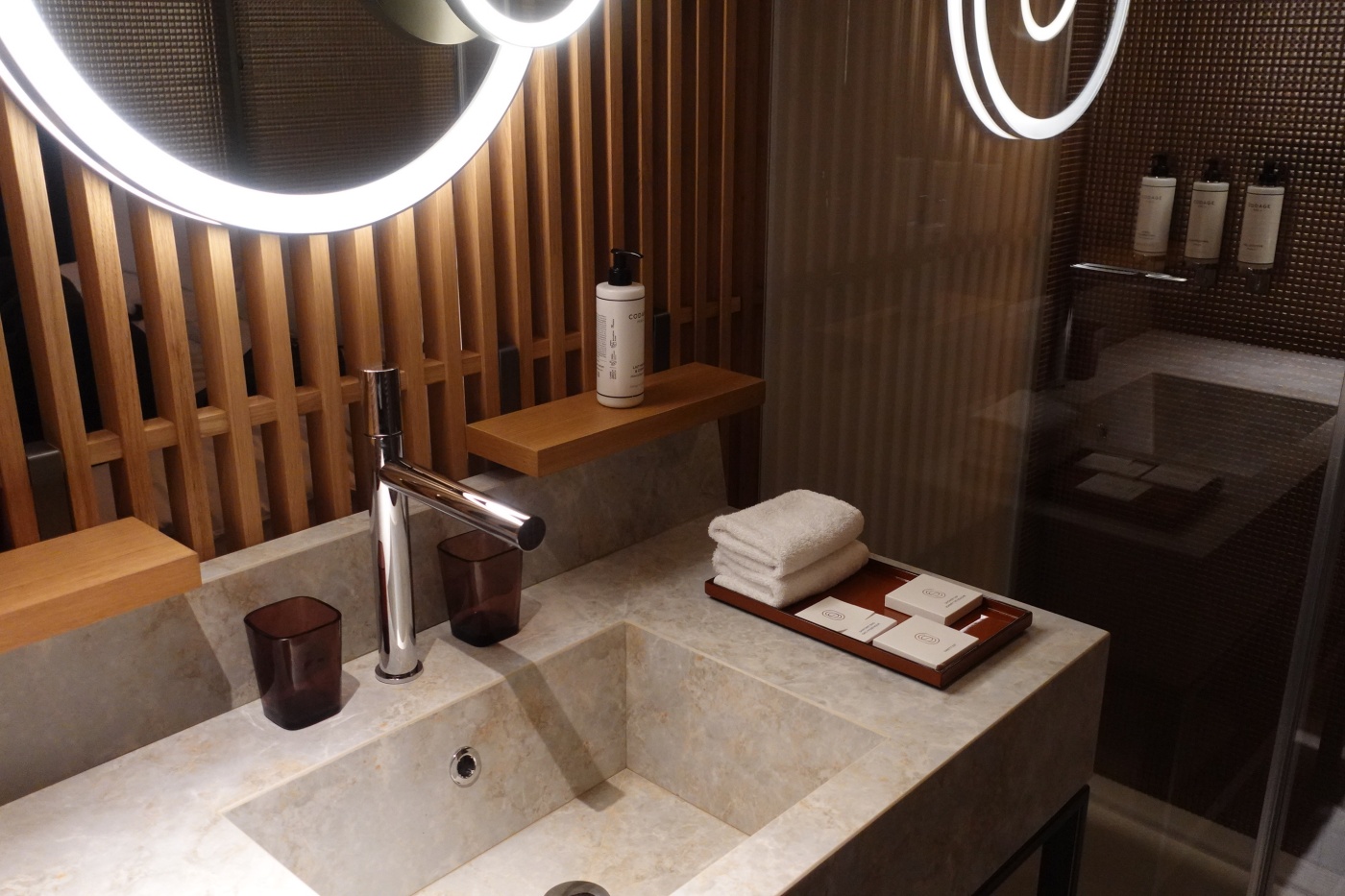 개수대 주변에 선반에 가져간 세안 용품 및 화장품들을 정리해둘 수 있어서 사용하기 편리했다. 욕실 어메니티는 CODAGE 라는 마레 지역 기반의 브랜드의 것이었다. 환경보호를 명목으로 일회용 어메니티 대신 대용량 펌프 어메니티를 제공한다.