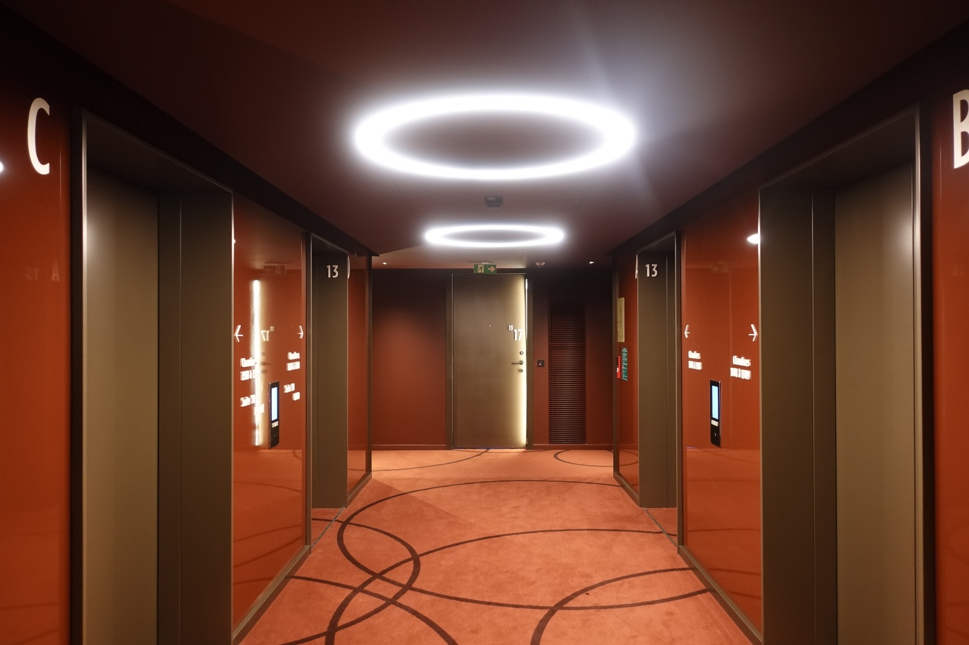 로비 기둥의 열주는 프랭크로이드 라이트가 건축한 존슨왁슨 빌딩의 내부 공간을 오마주하여 디자인됐다. 벽돌을 쌓아 올린 모양으로 디테일을 낸 핑크빛 반사 재질로 마감해서 물리적으로 좁은 공간을 시각적으로나마 넓게 확장한다. 오렌지에서 핑크로 이어지는 따뜻한 색감의 로비 색채 계획이 로맨틱한 파리 도시와 잘 어울린다.