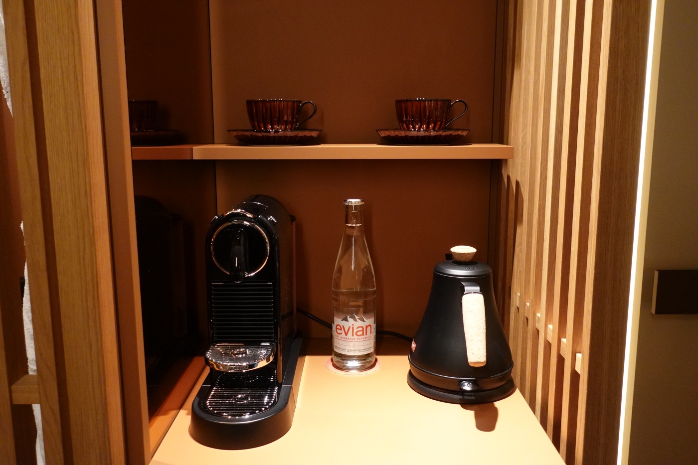 정제수로 에비앙물을 주고 커피 머신과 티를 우려 마실 수 있는 전기포트 주전자가 있다.