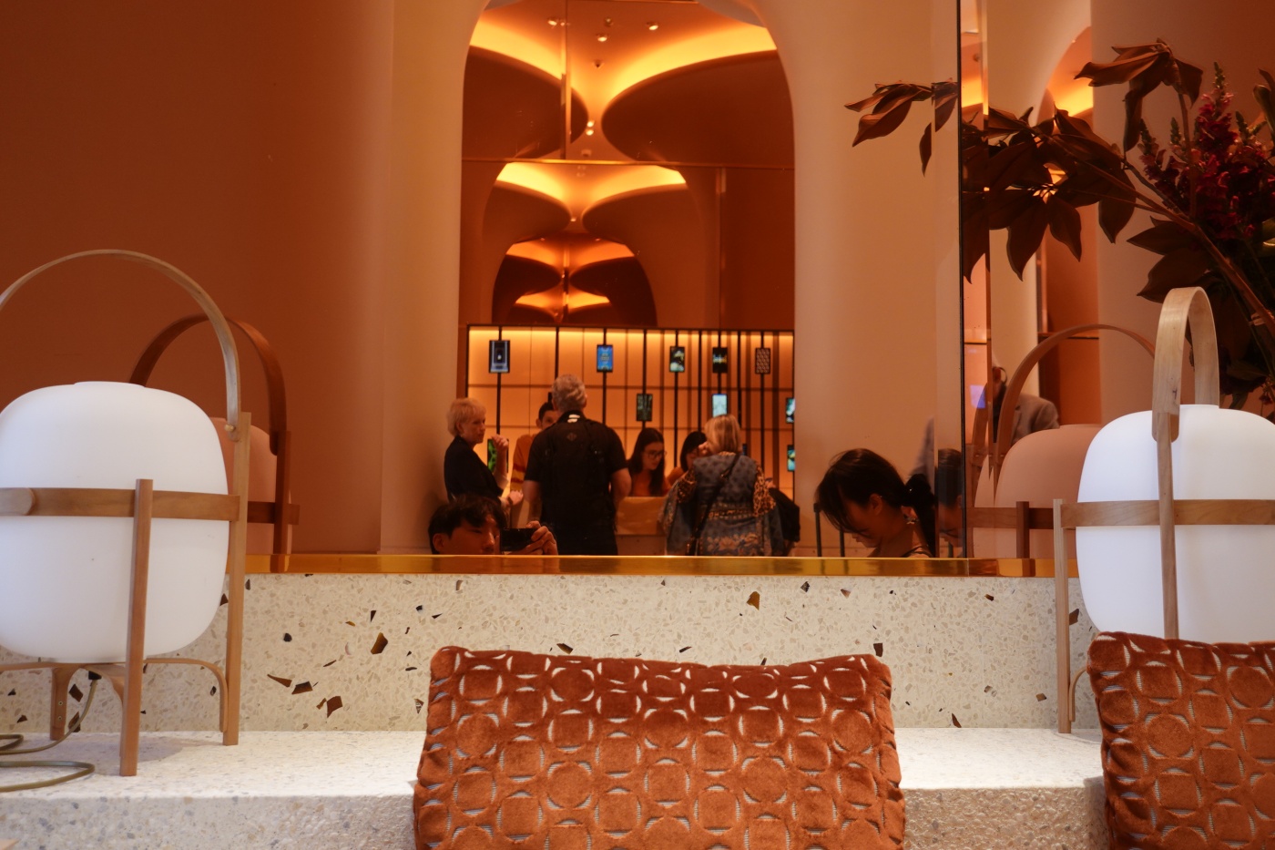 한쪽 벽면이 주황빛 반사 재질로 마감되어서 좁은 리셉션 라운지를 시각적으로나마 개방감 있게 해준다.