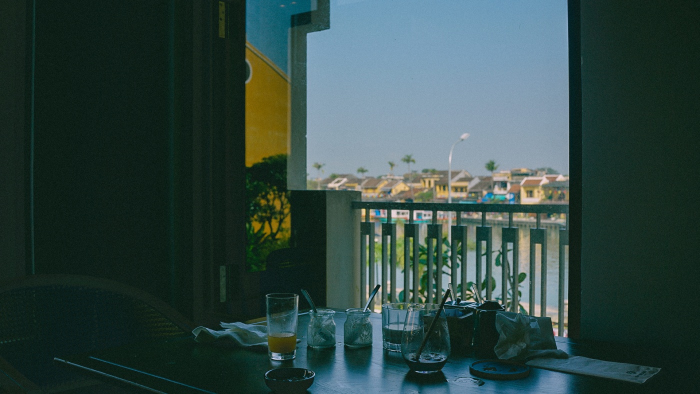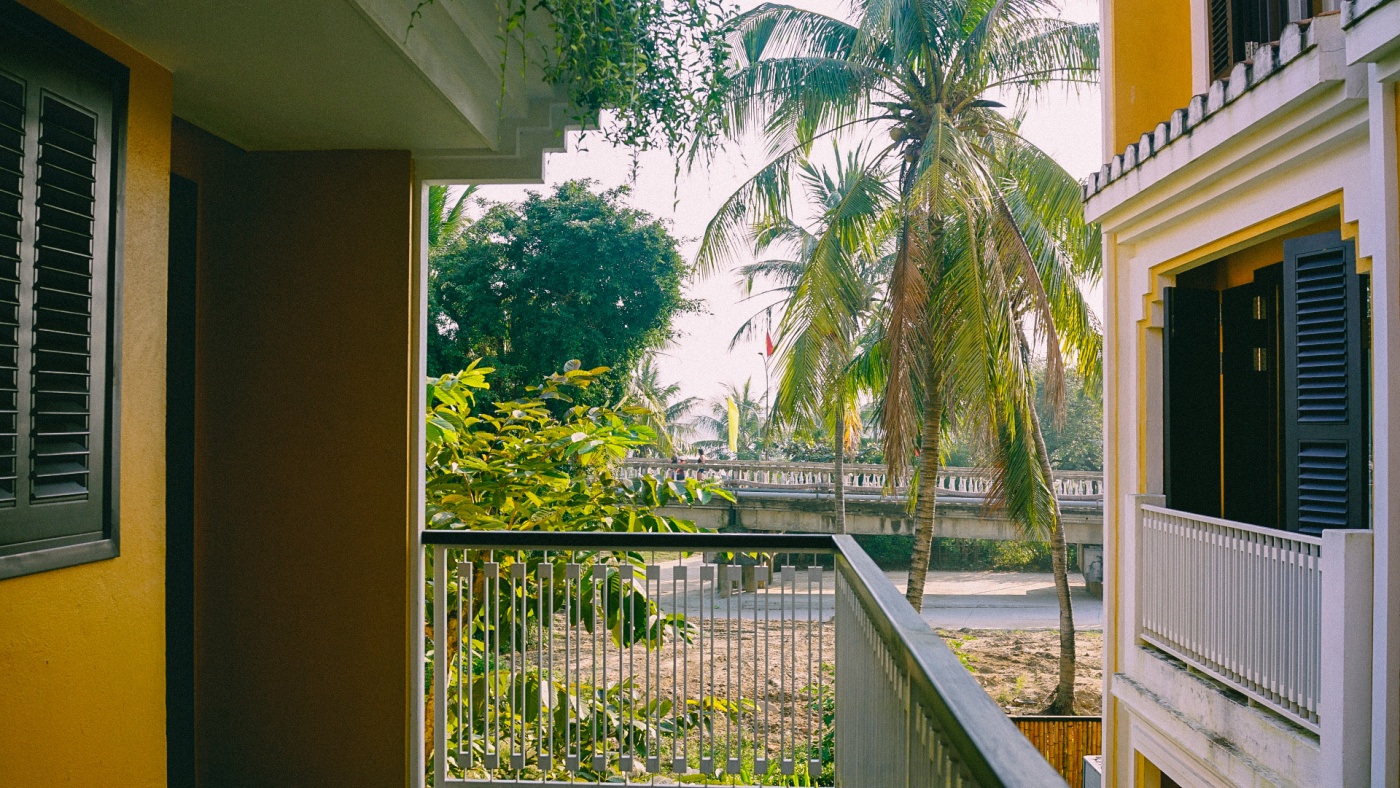 코너뷰 객실로 정면 창문에는 호이안 올드타운이 보이고 오른쪽 창문에는 깜남 다리가 보인다.