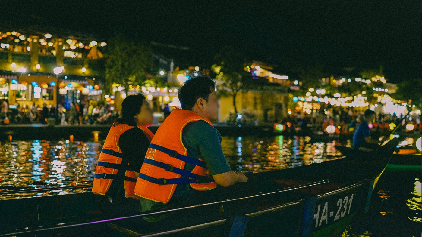 가장 붐비는 시간대였는데 약 10분정도 줄을 선 뒤 배를 탈 수 있었다. 기다리는 동안 호이안의 상징이라 할 수 있는 조명을 배경으로 사진도 찍고 감상하며 시간을 보냈다.