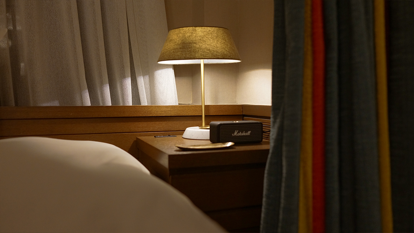 취침등은 구리로 만든 하단부를 터치하면 밝기조절과 끄고 켜기가 가능한 방식이었는데, 구리라는 물성을 터치한다는 감각이 아날로그적으로 느껴져 객실과 어울린다 생각했다. 충전식 무선 스피커는 마샬의 것으로 작지만 훌륭한 음질을 제공했다.