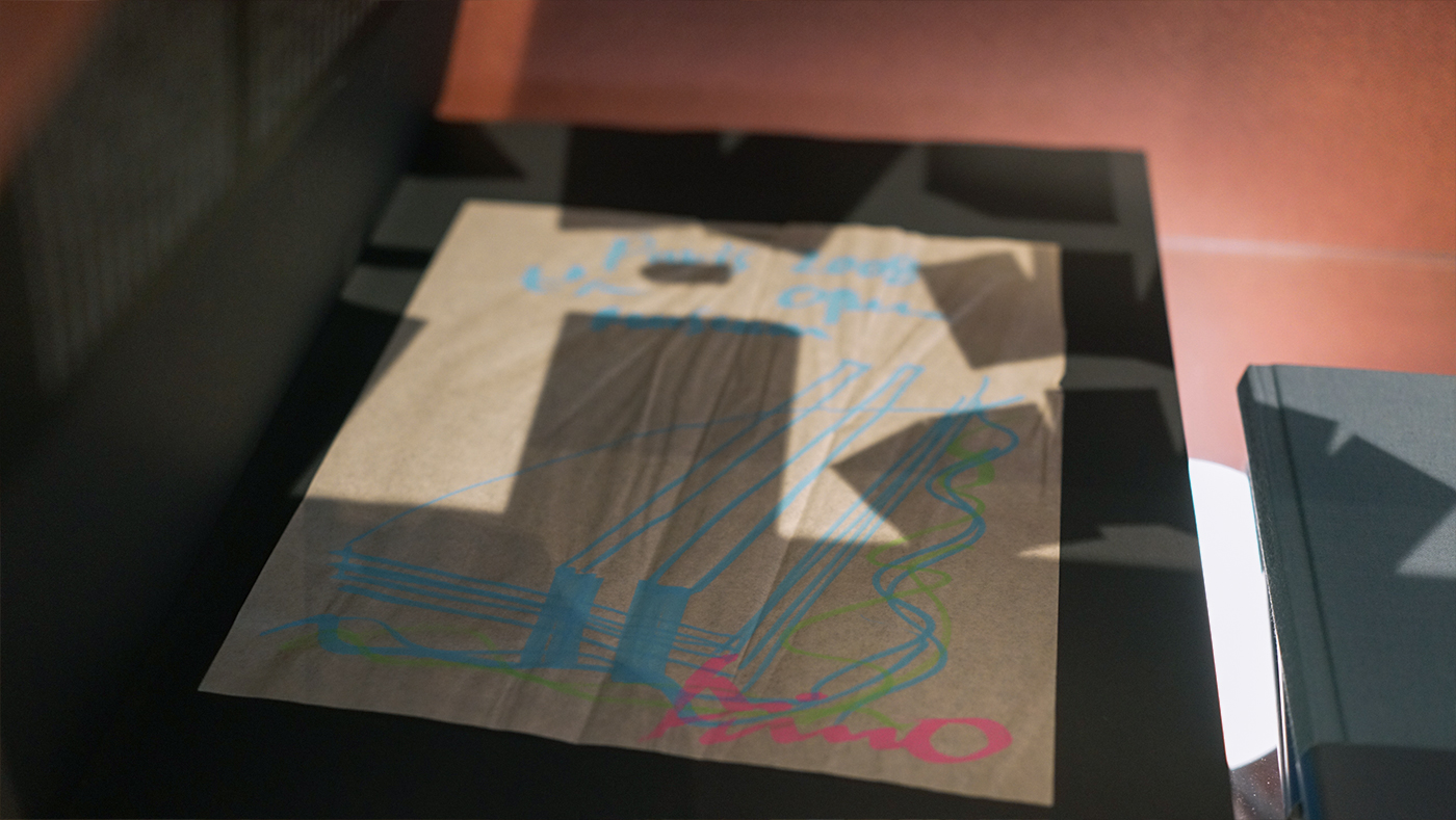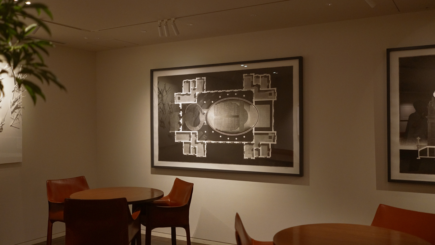 라이브러리 안쪽 룸에는 건축가 안도 다다오가 공모했던 공연장 설계안 입면도와 평면도가 있다.