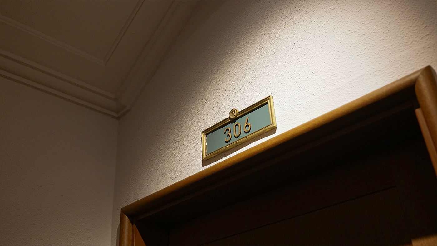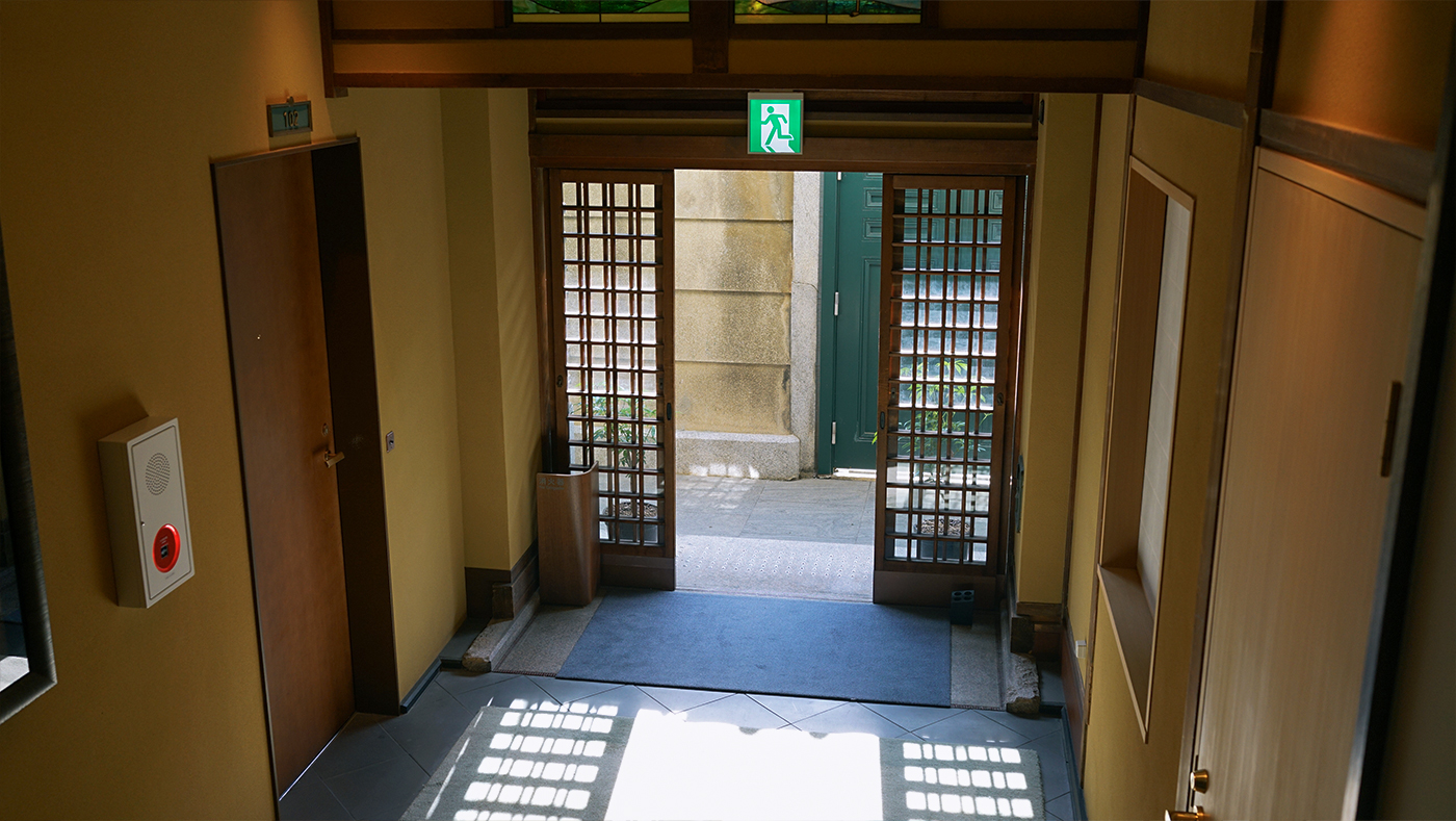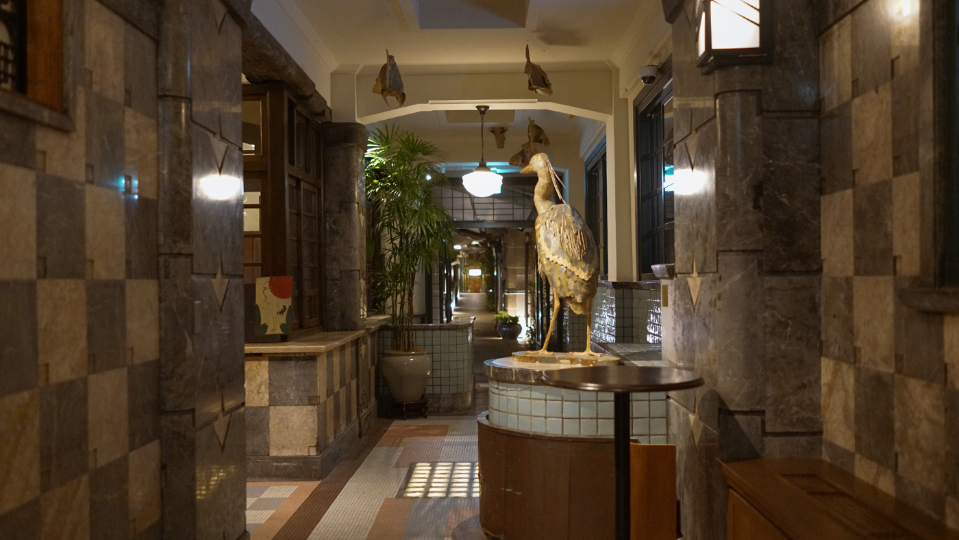 예약한 수페리어킹 객실이 있는 하트동으로 들어간다. 입구의 쇼와초기 아르데코 풍 장식이 보존되어 있다. 무겁고 육중한 벽을 보니 과거의 시간대로 전이하는 듯한 묘한 분위기마저 감돈다.