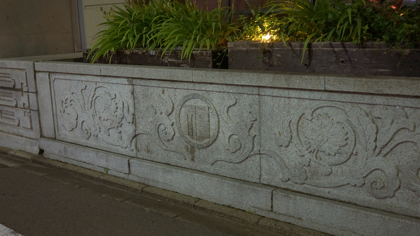 아마도 사옥을 지었던 1930년부터 자리를 지켜왔을 화단 석재 마감 장식. 쇼와 시대 초기에 유행했다는 아르데코 장식이 당시의 미의식을 보여준다. 마루후쿠 로고는 이곳에서도 존재한다.