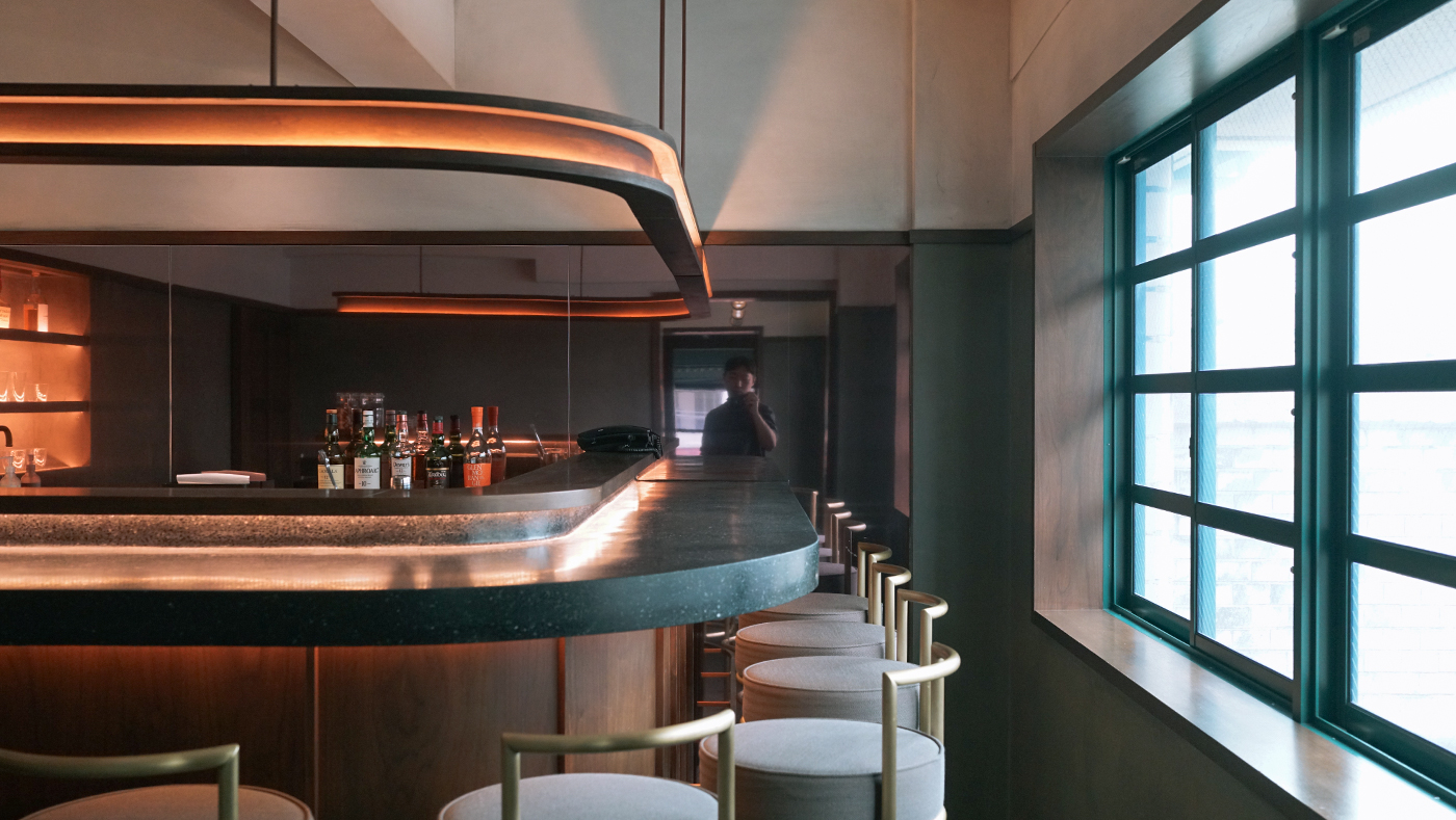 천장에는 아르데코풍 우물장식이 있고, 그곳에 2개의 펜던트 조명이 달렸다. 과거에 필자가 안도 다다오 건축가가 서울에 설계한 재능아트센터 취재 당시 무엇이든 2개를 나란히 배치한 건축적 디테일을 유심히 본 기억이 있는데, 하나하나 설명하자면 구차하지만, 해당 펜던트 조명 2개의 배치도 당시의 건축적 디테일을 연상 캐 하는 것이었다.