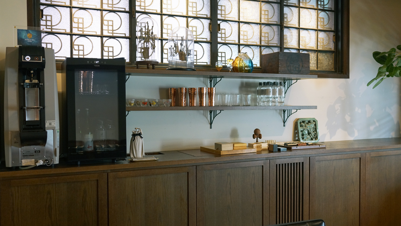 접견실 한쪽엔 간단한 무료 미니바와 과거 닌텐도에서 만든 보드게임 몇 점이 있다.