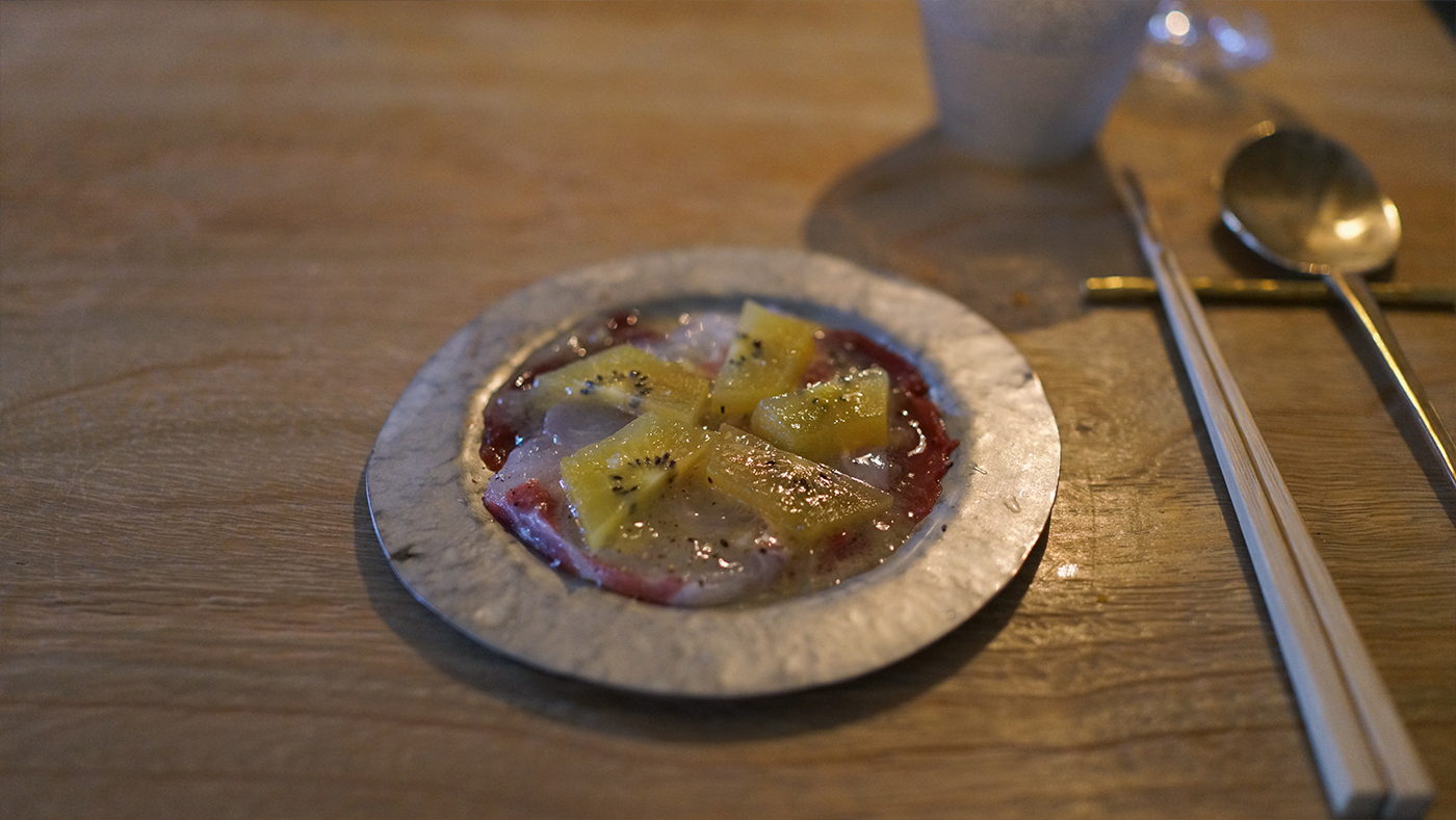 카르타는 요리 전문가 호소카와 아이 細川亜衣 씨가 요리뿐만 아니라 인테리어 및 식기까지 감수한 레스토랑이다. 일본 고유의 향신료, 조미료, 발효 식품을 사용하여 계절의 변화에 맞춰 몸과 마음을 치유하는 요리를 제공한다고 한다. 요리 감수에 있어서 그녀는 손님이 ‘요리사의 작위를 느끼게 하지 않게’ 하도록 요리사에게 조리법을 전수한다고 한다. 레스토랑 소개 란에서, 이곳의 요리를 형용할 때 야사시 優し 라는 단어를 쓴 것은 부드럽다는 물리적 식감뿐만 아니라 친절하고 겸손하다는 요리사의 정신적 태도도 내포하리라는 생각이 들었다. 카르타 カルタ carta 라는 네이밍에 대해서도 생각해 본다. 카르타는 일본의 카드놀이를 의미하는 단어로 일본어로 가루타라고 발음한다. 카드놀이를 제작하며 성장한 기업, 닌텐도의 사옥이었던 장소성에 아주 걸맞은 이름이다. 게다가 도예가가 손으로 빗어 만든 타일과 식기류, 유리작가가 만든 조명, 구리를 두들겨 펴서 만든 숟가락 등 이 레스토랑에 존재하는 수많은 손으로 만들어 낸 물성들을 떠올려 보면, 약 500년 전 사람들이 손을 이용해 즐겨 온 카드놀이를 뜻하는 이름은, 이 이름이 아니면 안 될 것 같은 당위성까지 부여한다.