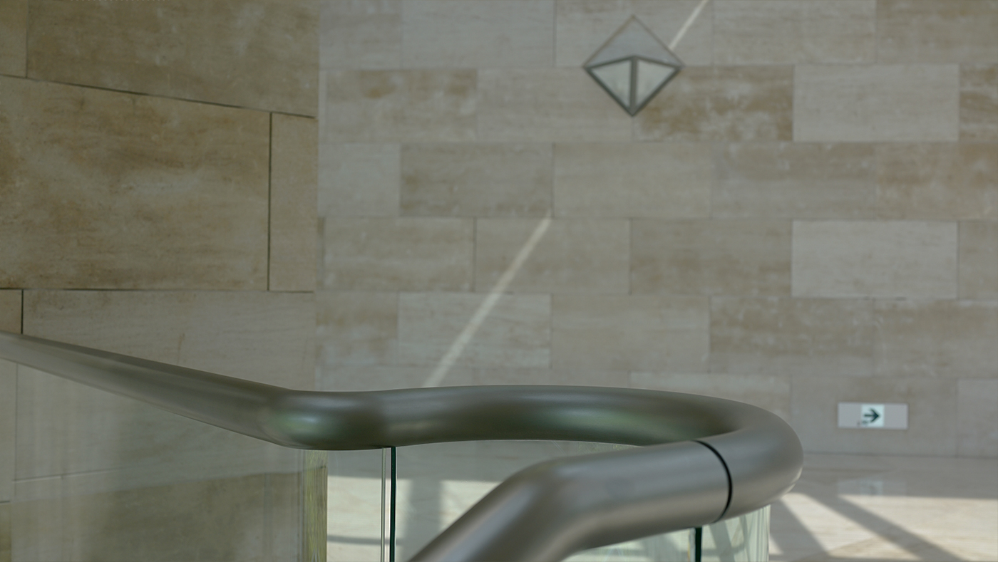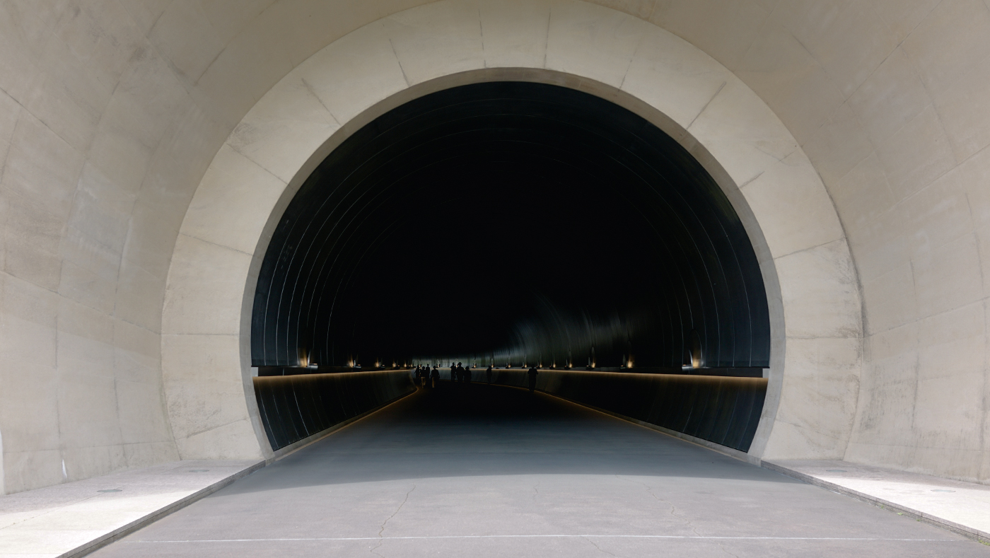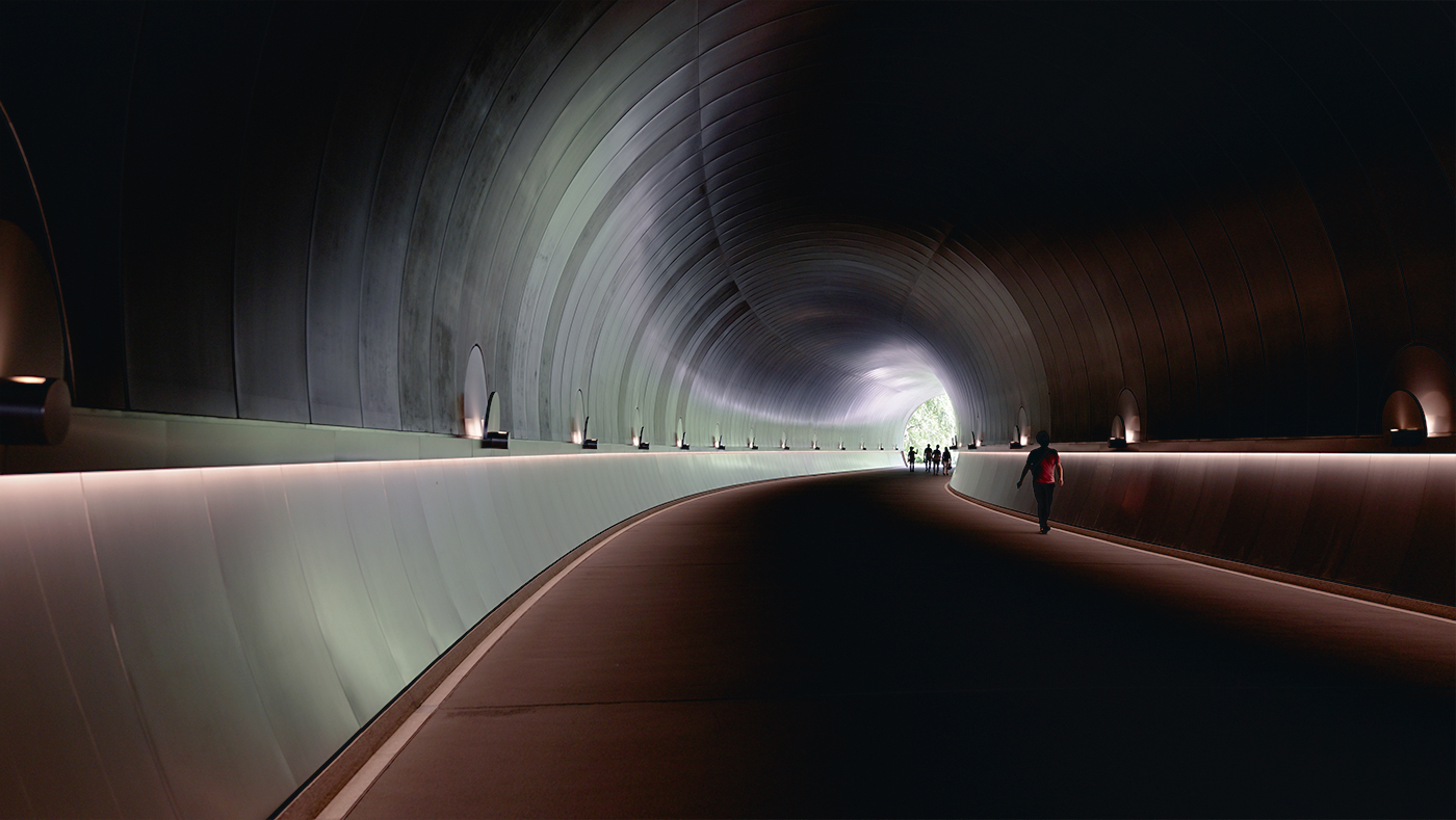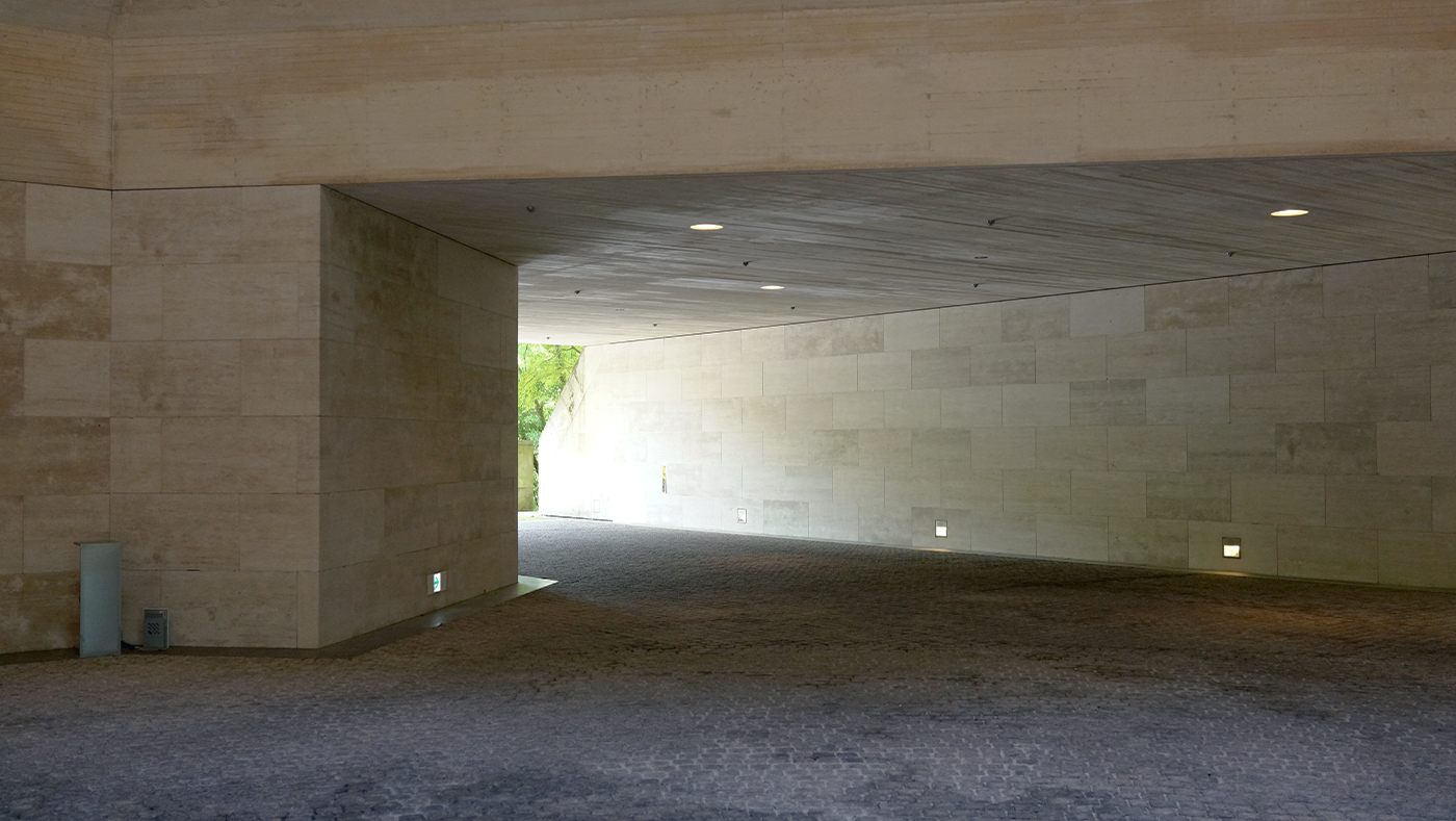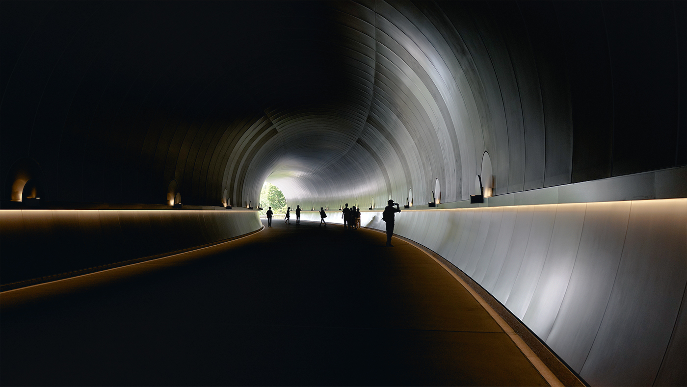 본관으로 향하는 터널은 금속재로 마감되었고, 내부는 약한 간접 조명만이 설치되어 있다. 터널 반대편 출입구로 들어오는 자연광이 금속에 반사되어 드라마틱한 분위기를 연출하고, 기대감을 고양한다.