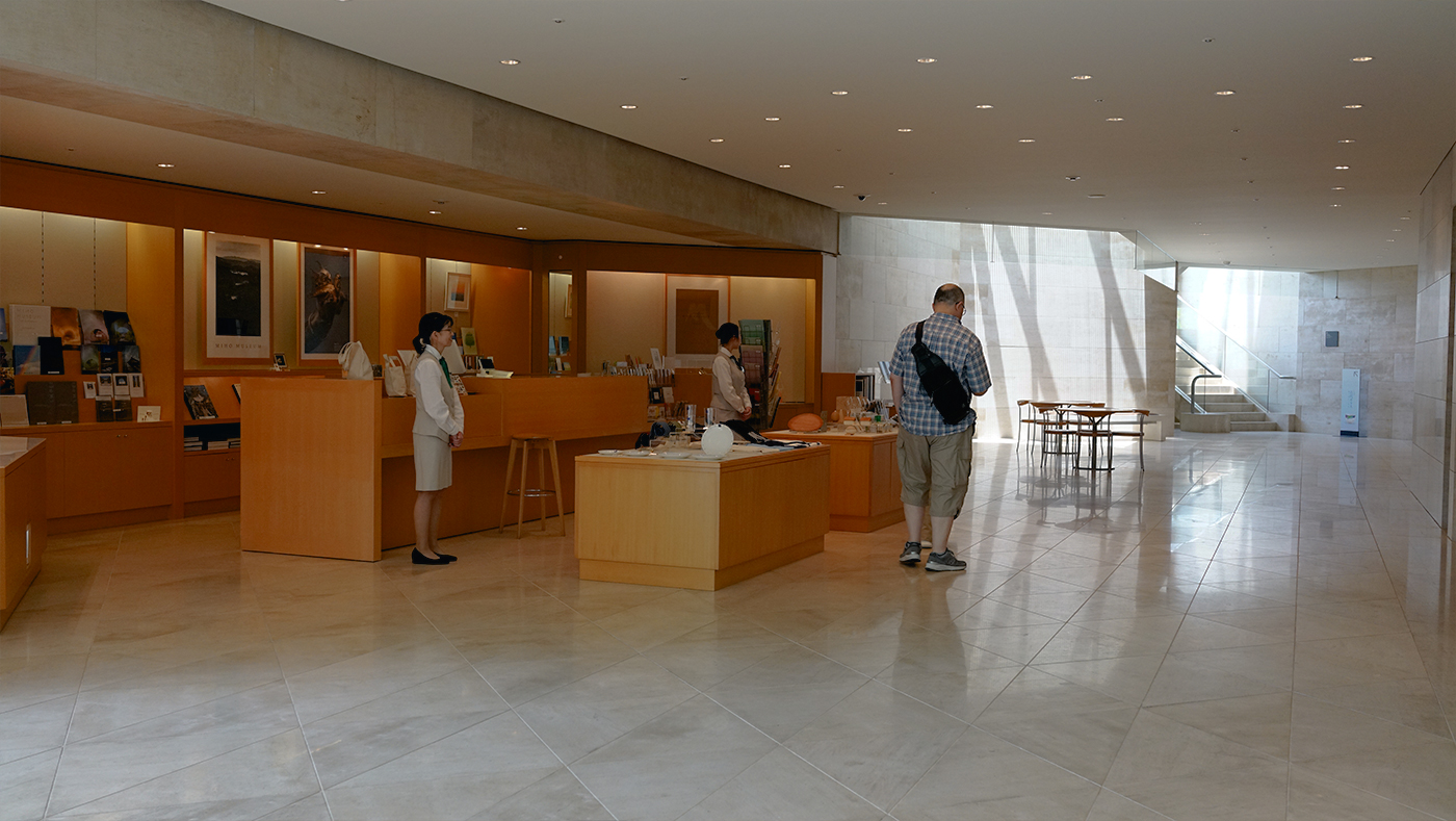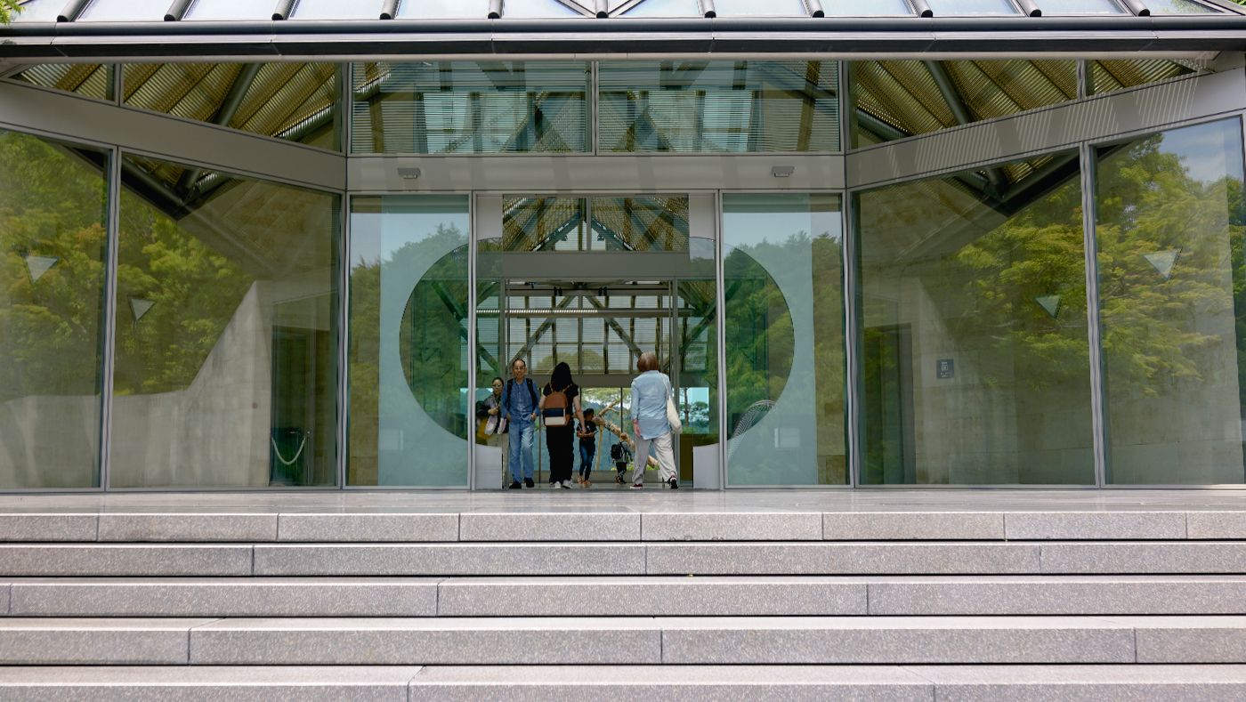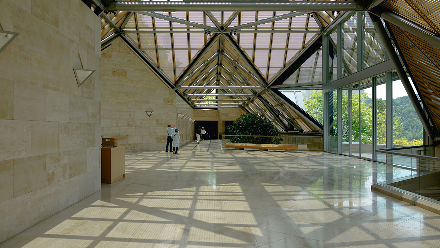 미호 뮤지엄 본관의 입구를 보면, 철골 유리 마감으로 직선적인 일본의 전통 처마 지붕을 형상화 한 것을 볼 수 있다.