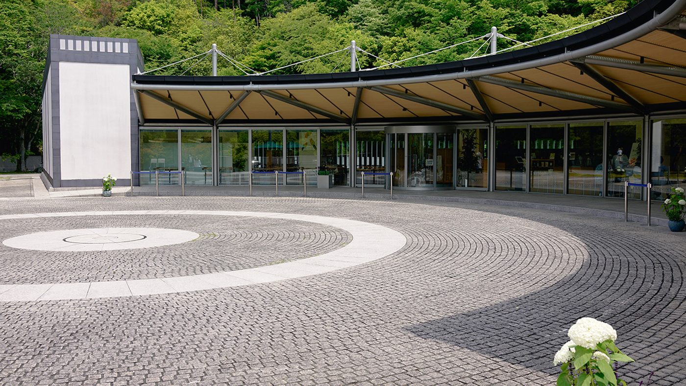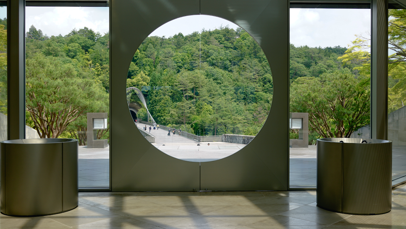 미호 뮤지엄 본관 주출입구는 원형의 자동문으로 만들어졌다. 계단을 오르며 서서히 모습을 드러내는 원경의 소나무 풍경이 원형의 문 너머로 선명해진다.