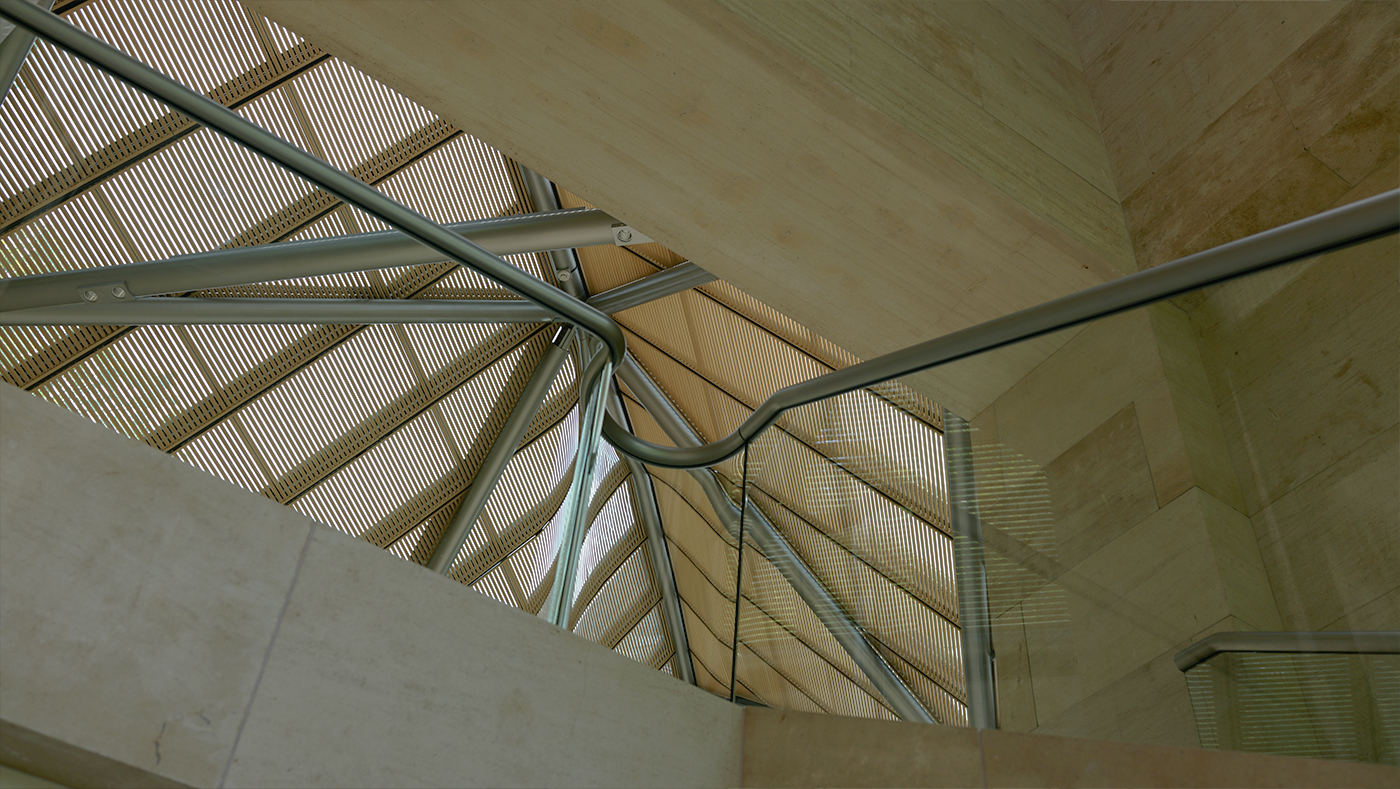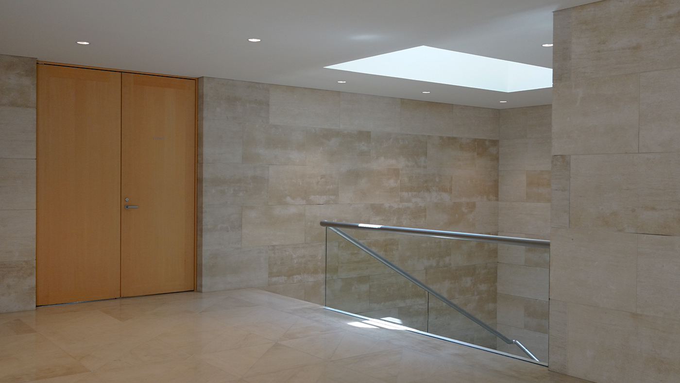 벽, 바닥, 계단이 모두 사암으로 마감된 북관 내부로 자연광이 부드럽게 쏟아진다.
