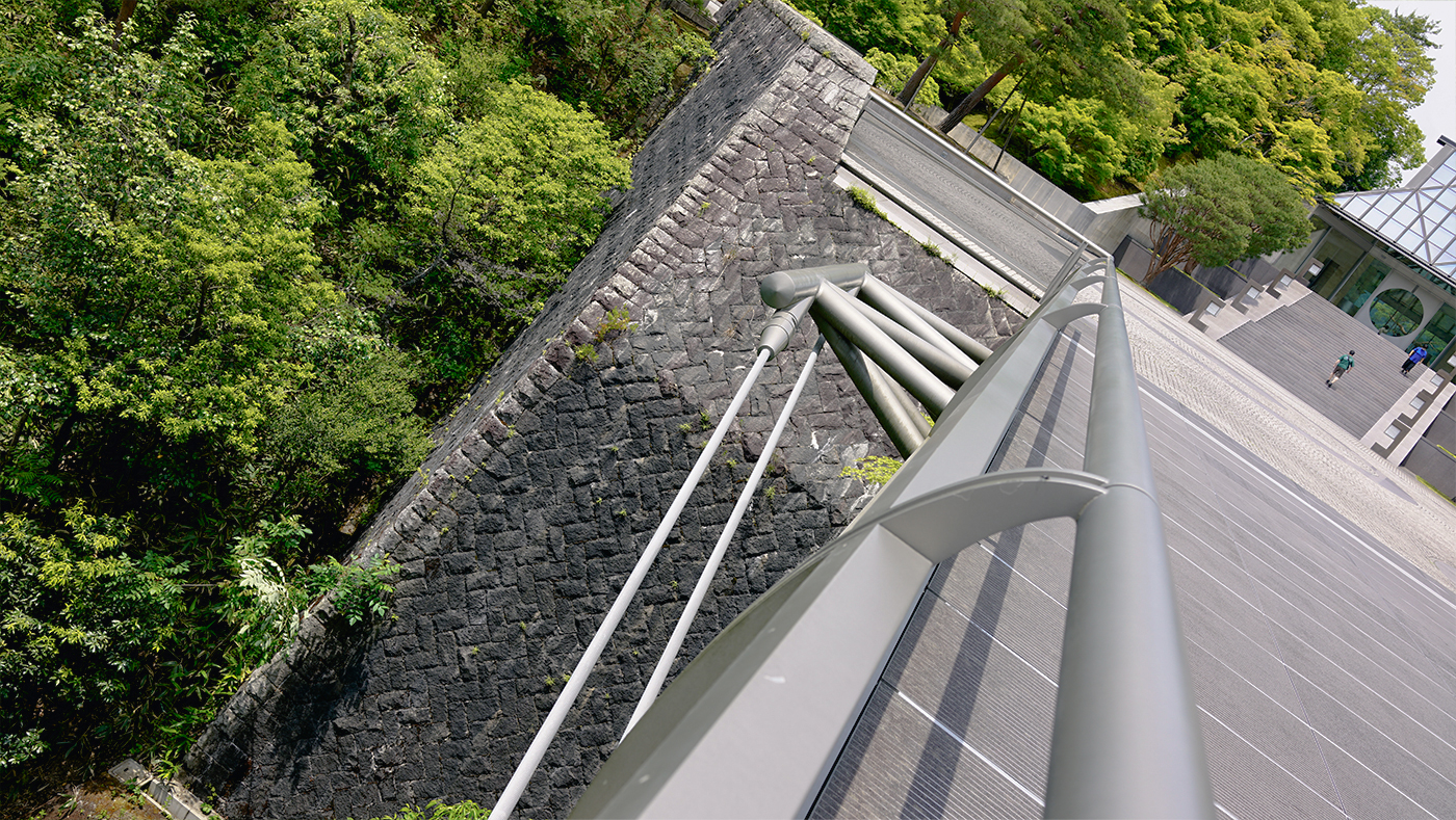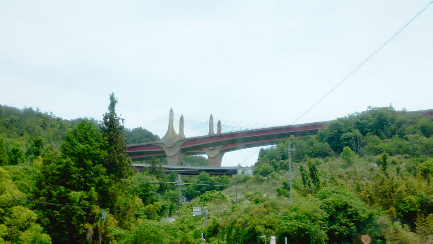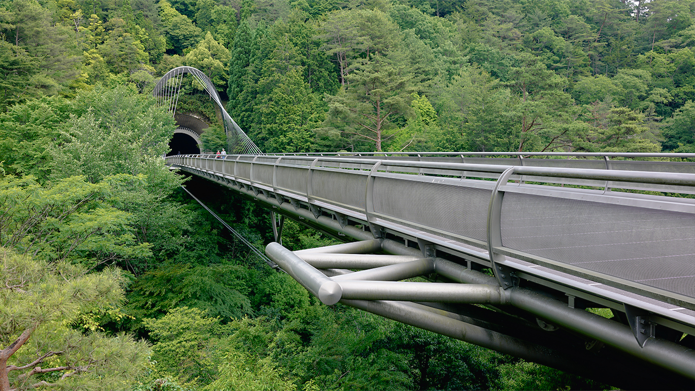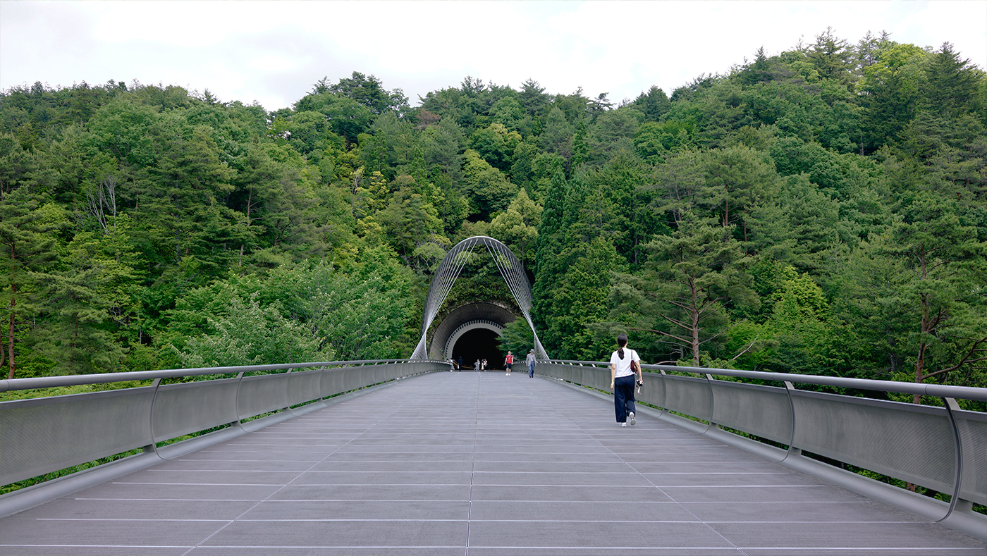 터널을 빠져 나오면 케이블을 지탱하는 구조물이 하나 보이는데, 터널과 미호 뮤지엄 본관을 잇는 사장교 형식의 다리이다.