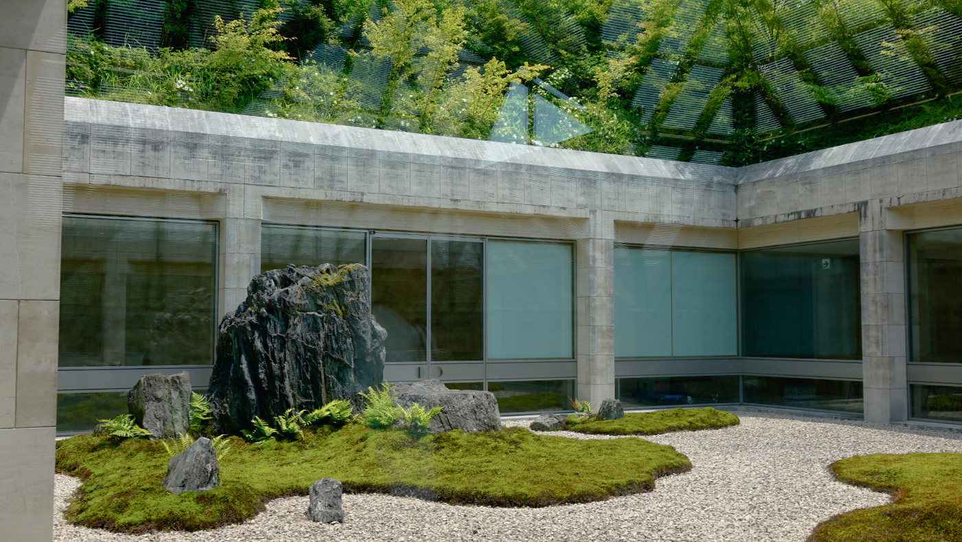 2층 중정에는 밝은 사암과 대비되는 검은색 돌과 이끼의 야외 정원으로 꾸며져 있다. 해당 야외 정원은 전시장에 들어갈 때 눈치채지 못했던 걸 보면, 출구에서 잘 보이도록 만들어졌고, 이는 전시 관람을 마치고 마음을 다음 일정으로 넘어가기 전 마음을 추스릴 수 있도록 한 것이 아닐까 싶다.