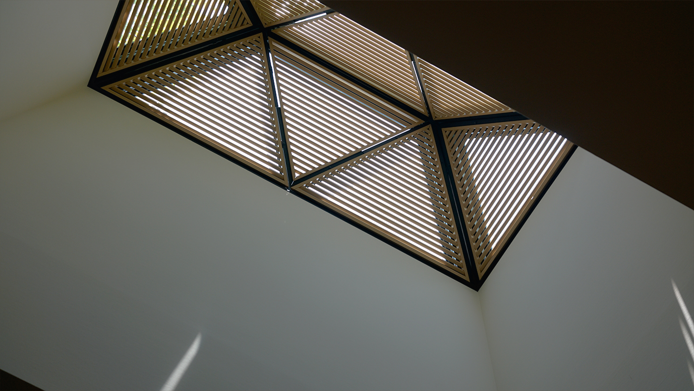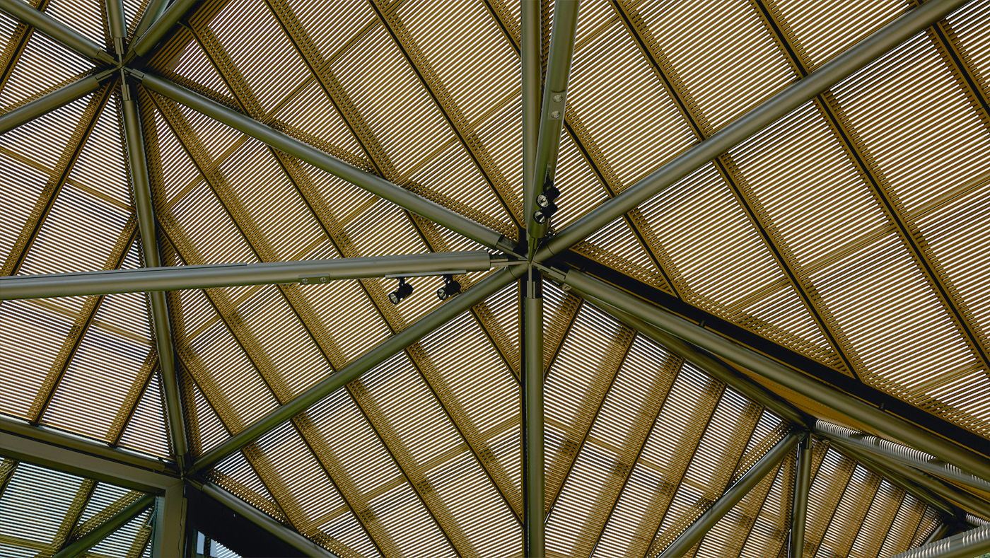 은빛의 트러스 구조체에 전기설비까지 삽입했다. 목재로 하나하나 짜 맞춘 천장루버의 세심함이 엿보인다.