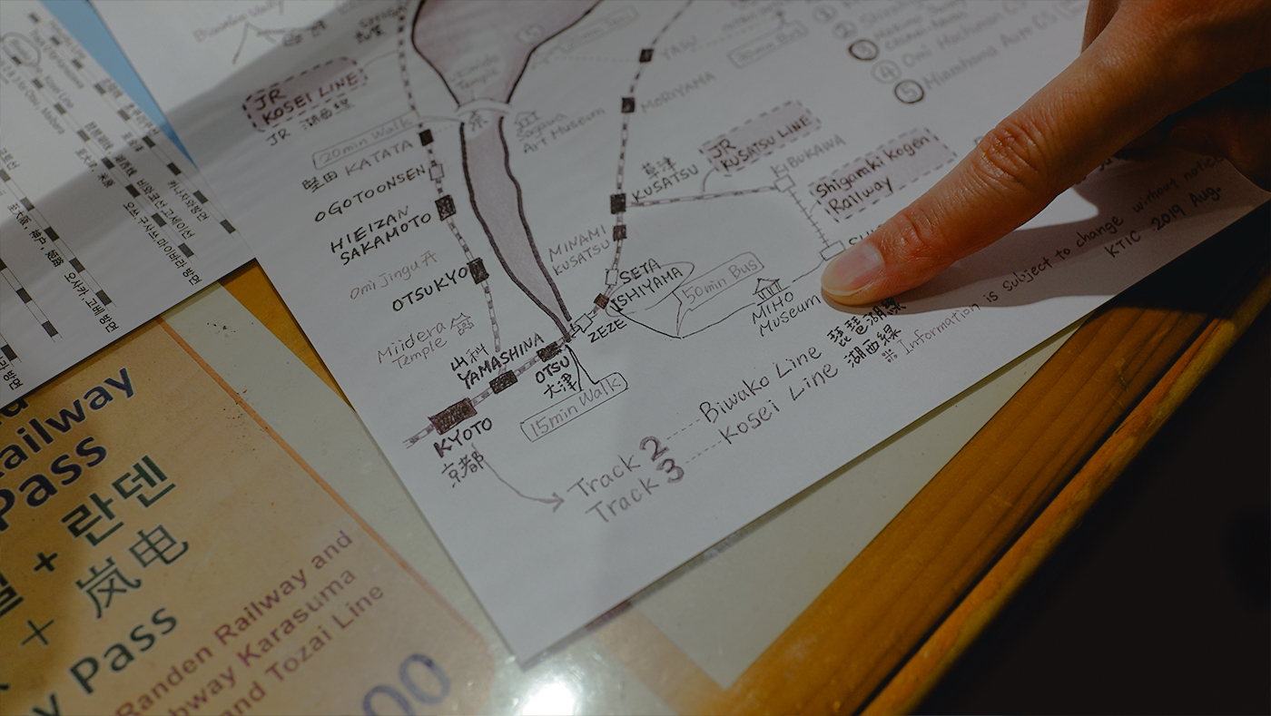 교토종합관광안내소 담당자 분께서 어딜가냐 물으셔서 미호 뮤지엄에 간다 하였더니, 서류함에서 손으로 그린 지도를 복사한 비와호 안내도를 건내며 아주 친절하게 설명 해 주셨다.