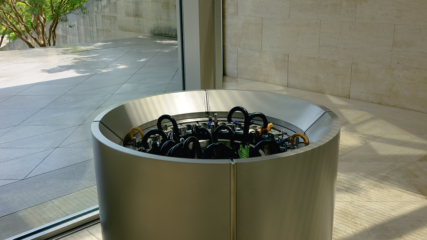 입구에는 깔끔한 디자인의 우산과 양산 보관함이 있다.
