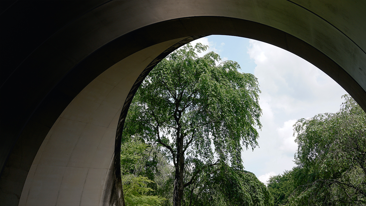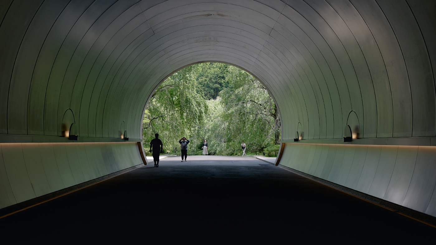 터널 금속 마감재에 출구 너무 녹음의 푸르름이 비친다. 벚나무 꽃이 만개하는 시즌에는 녹음의 푸르름이 아니라, 벚꽃의 분홍빛이 이 터널을 가득 채운다. 기회가 된다면 벚꽃 시즌에 또 방문을 해보고 싶다.
