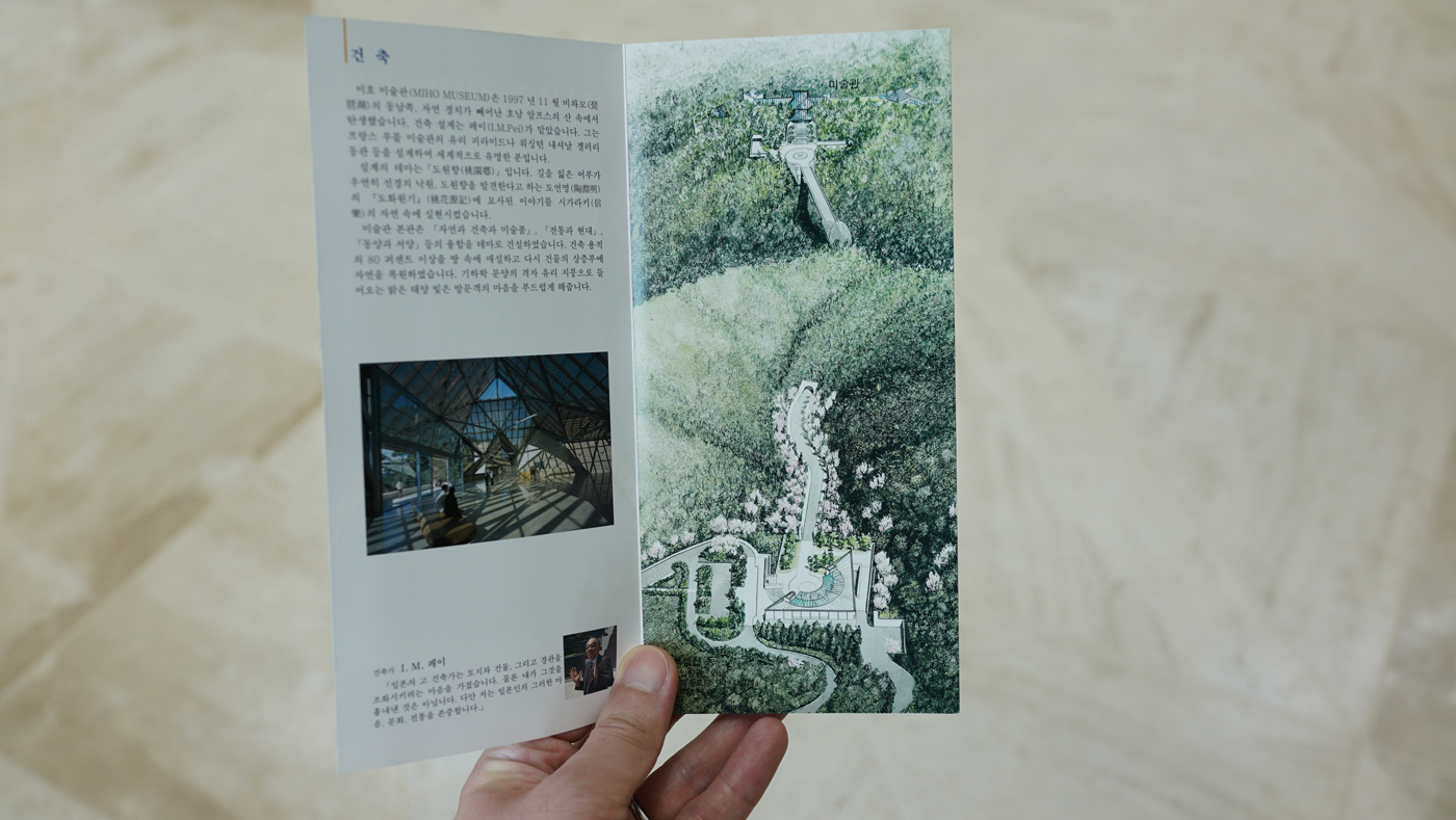 미호 뮤지엄 한국어 팜플렛에 건축 설명이 간단히 안내되어 있다. 위 팜플랫 내 약도에서 아래가 리셉션 파빌리온, 숲속 터널을 지나 다리를 건너면 미호 뮤지엄 본관에 다다른다.