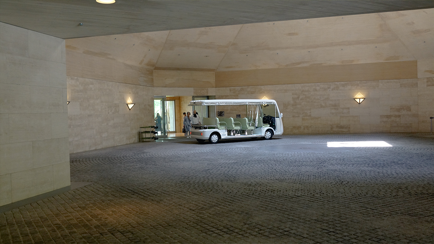 리셉션 파빌리온에서 미호 뮤지엄 본관까지는 약 1km 거리를 걸어 가야 한다. 셔틀 카트가 운행되는데 장애인 전용인 듯했다.