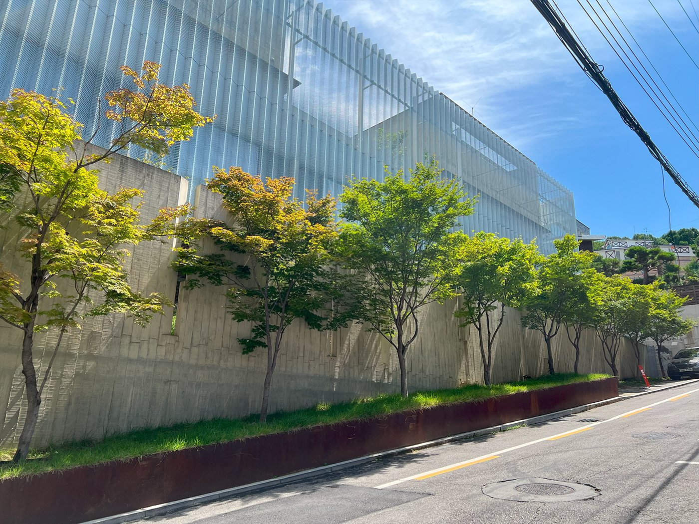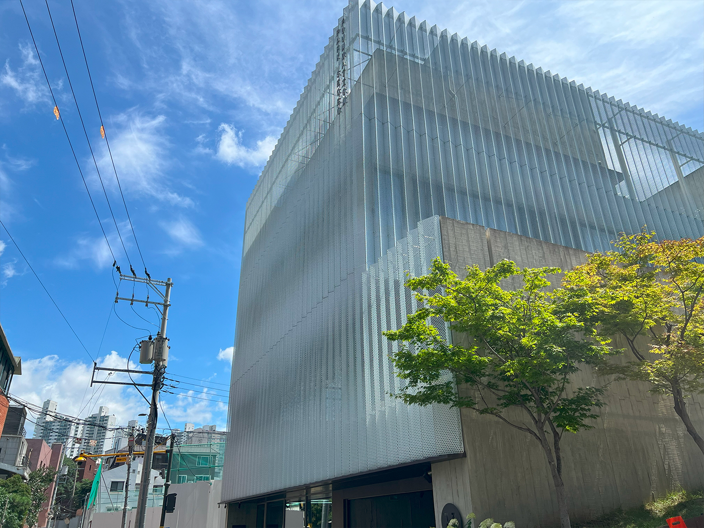 해당 글의 뒤에 더 설명하겠지만, 건축가는 박서보 작가의 '공기색'과 '묘법'을 차용하여 해당 알루미늄 타공 마감재를 사용했다고 한다. 빛의 방향(계절과 시간)에 따라 보는 각도에 따라 건축물이 인상이 부드러운 그러데이션을 이루며 변모한다. 박서보 작가의 작품을 건축이라는 완전히 스케일로 재경험할 수 있다.