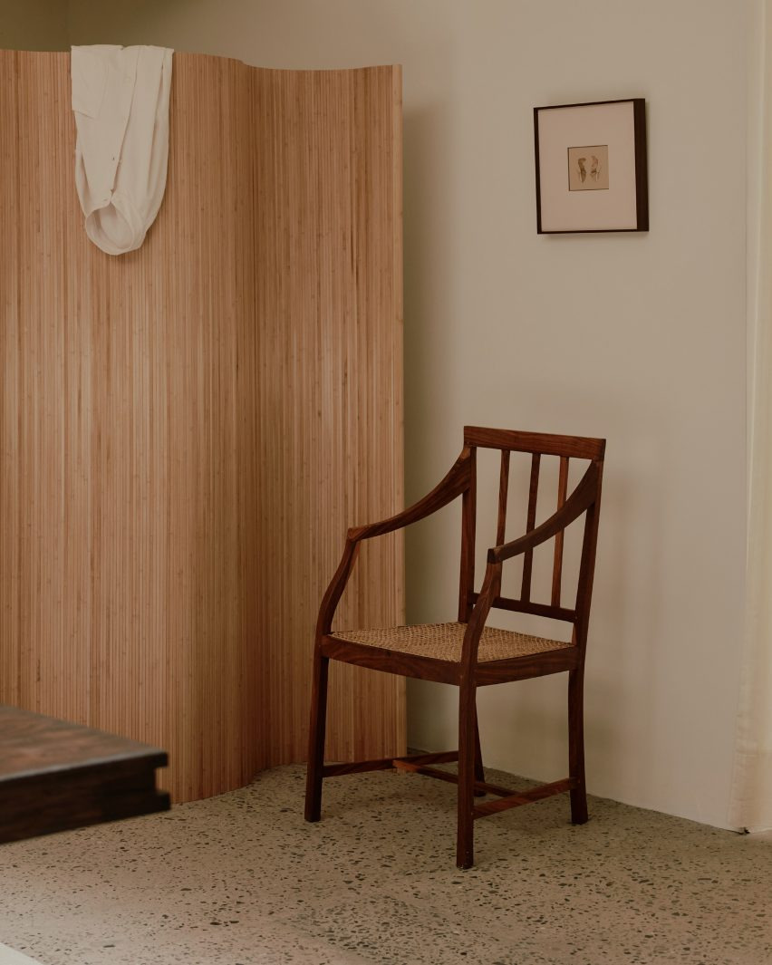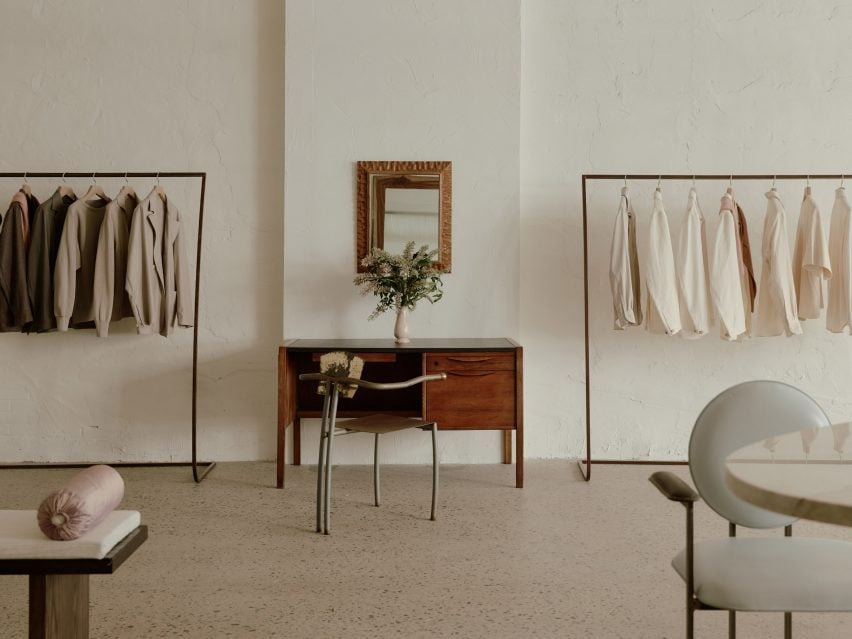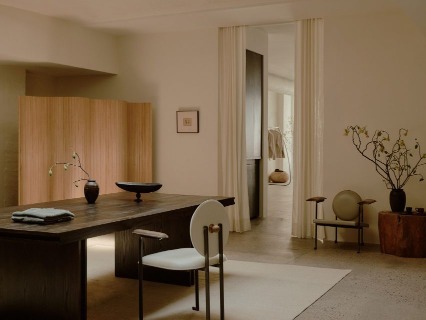 후면의 맞춤형 공간은 스카이라이트 아래에 위치한 큰 고무나무 테이블을 중심으로 구성됩니다. 이 테이블은 맞춤형 피팅의 중심지 역할을 하며, 같은 나무로 만든 큰 내장형 옷장이 이를 둘러싸고 있습니다. 팀은 이 디자인이 매장의 중심을 잡아주며 피팅 서비스의 핵심 공간으로 활용될 것이라고 설명했습니다. 또한, 공간 곳곳에 배치된 기하학적 MM 의자와 물결 모양의 나무 프라이버시 스크린이 기능성을 더합니다. 이러한 요소들이 조화를 이루어 방문객에게 편안한 환경을 제공합니다.